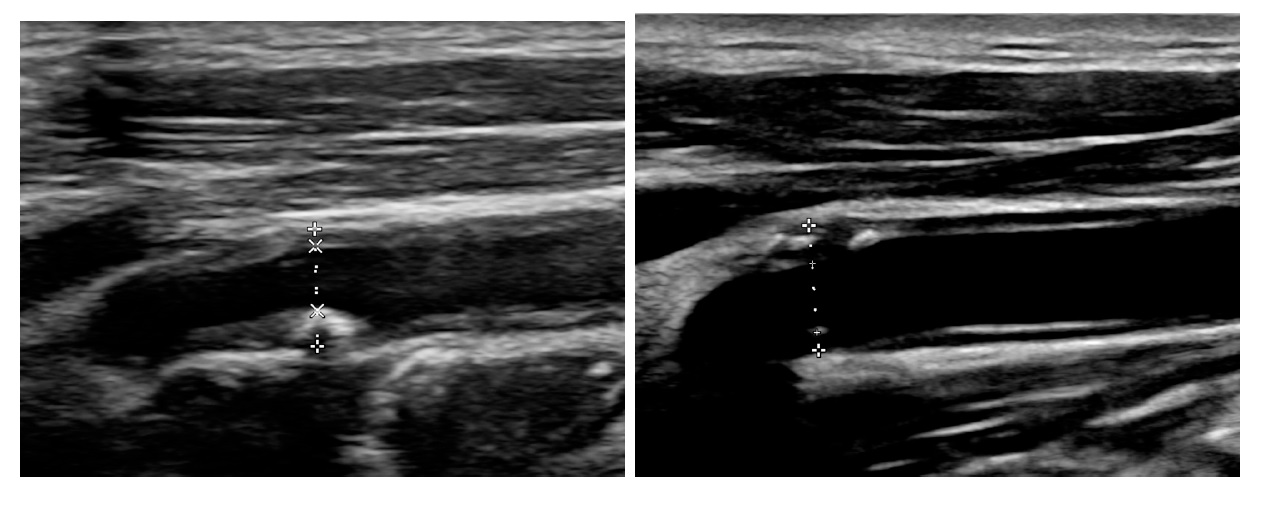 圖說:左圖為病人於 2022 年進行的頸動脈超音波檢查,可見血管內有明顯斑塊與狹窄,顯示動脈粥樣硬化程度嚴重。右圖為 2025 年追蹤檢查結果,血管斑塊明顯縮小、血流通暢且彈性改善,顯示經高強度降血脂藥(他汀類藥物)治療後,血管狀況顯著好轉/臺大醫院新竹分院提供