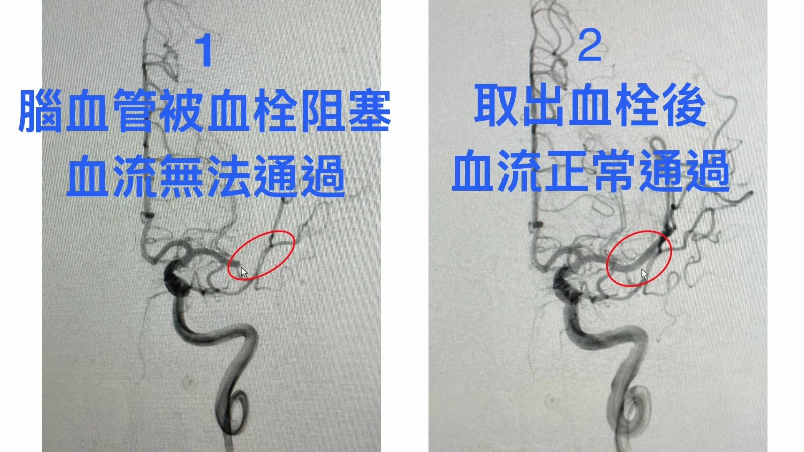 圖:從血管攝影可以清楚看見原本腦血管被血栓阻塞時,血流完全無法通過(左),取栓成功後血流可以正常通過(右)/花蓮慈濟醫院提供