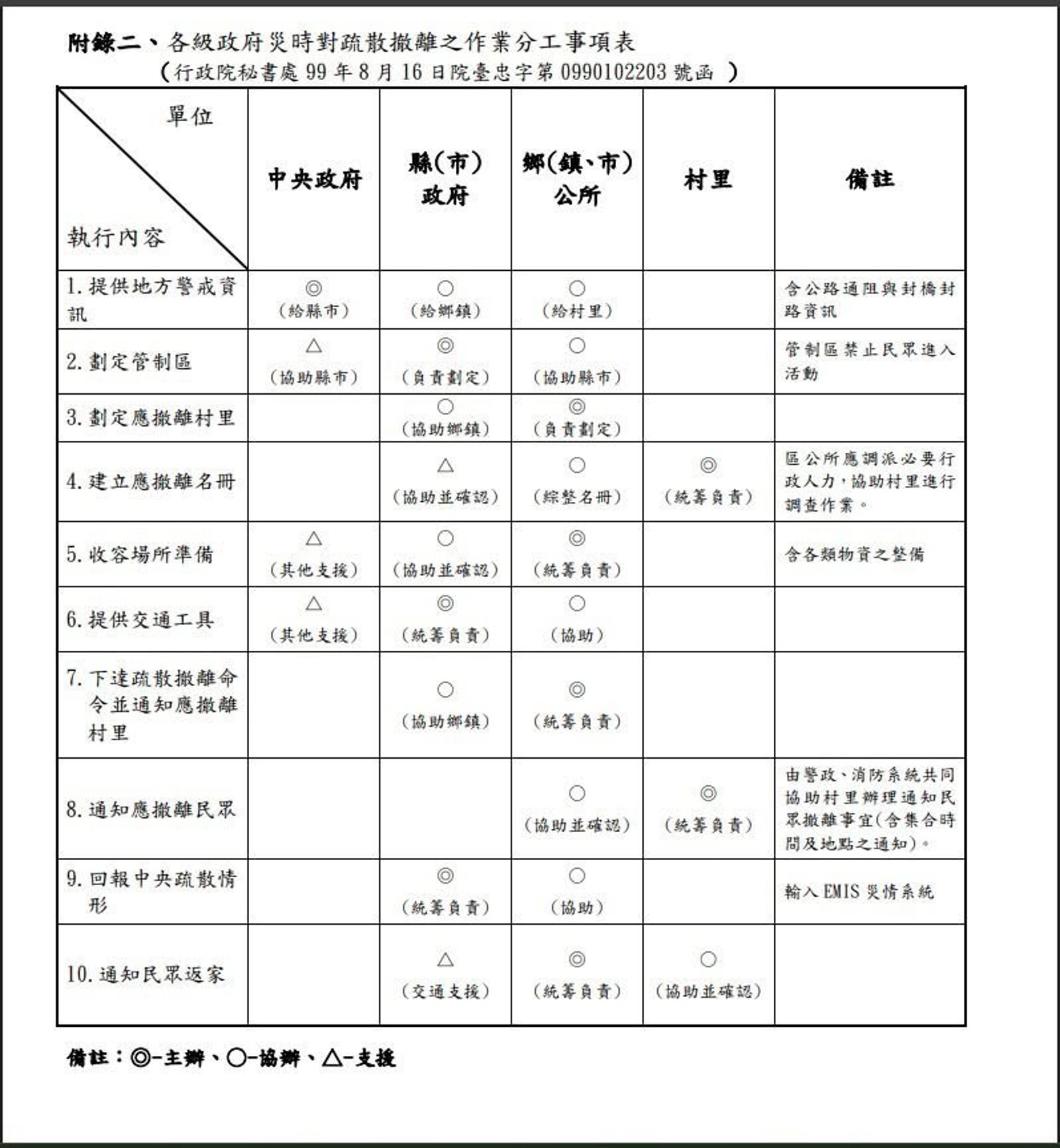 2010年版的《災害防救法》特色是建立一套三級分層負責制,由行政院、直轄市及縣市政府、鄉鎮市及原住民區公所分別設置災害防救會報,這其中,位於第二級的縣市政府由於掌握戶政與地政資料,又可直接指揮警消,扮演核心樞紐的角色。以這次最引關注的撤離疏散計畫為例,中央政府主責災害警戒的發布,但關於如何撤離?包括管制區如何劃定?哪些村里要撤離?誰來造冊保全撤離名單?以及收容場所與交通工具的準備?完全是由地方縣市政府指揮鄉鎮市公所主責。這項〈各級政府災時對疏散撤離之作業分工事項表〉,早就在民國99年由行政院秘書處發函各級政府留存(如下圖)。
