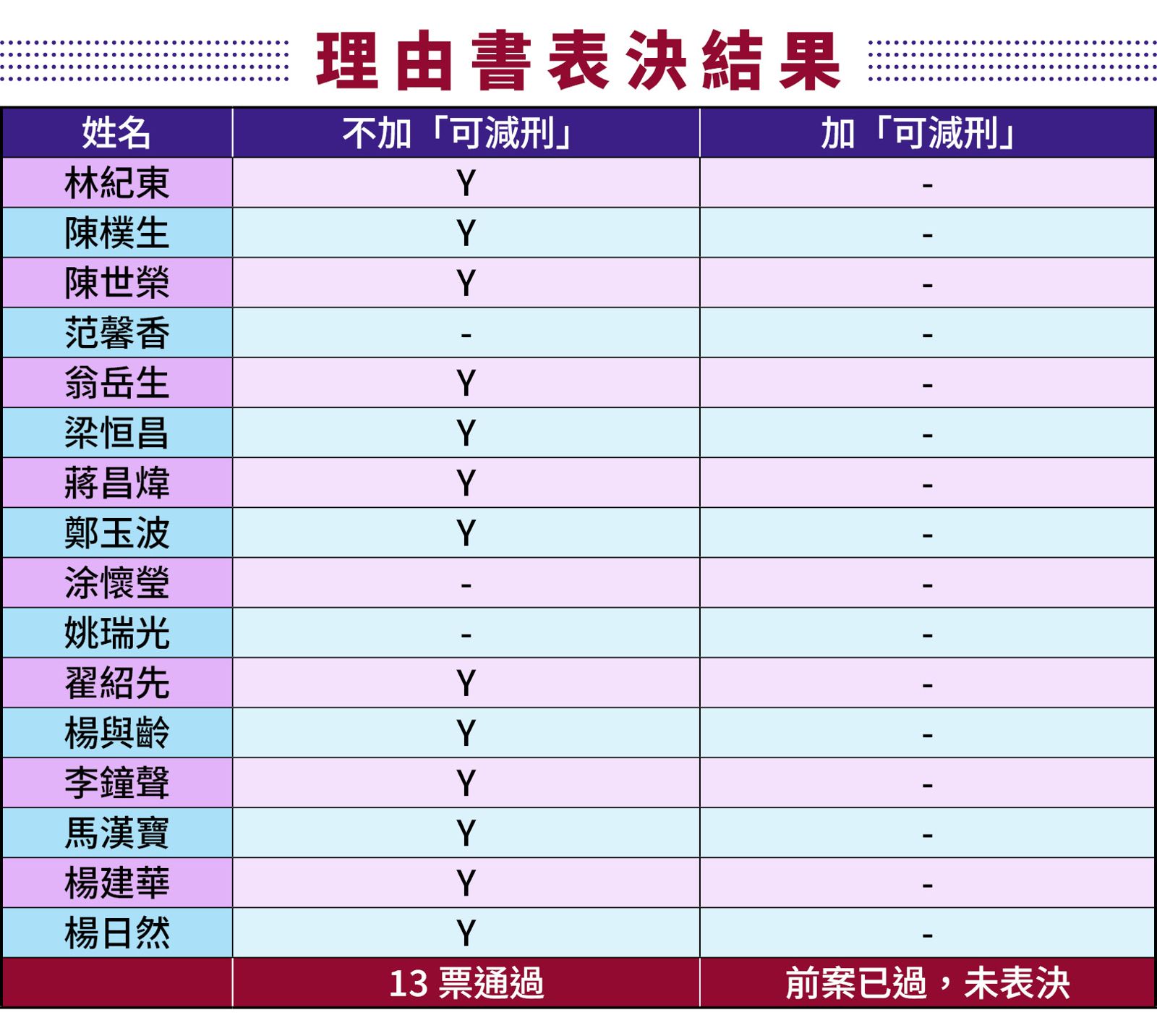 於是理由書也有「加」與「不加」兩案[2]付表決,「不加」之案獲得13票通過。