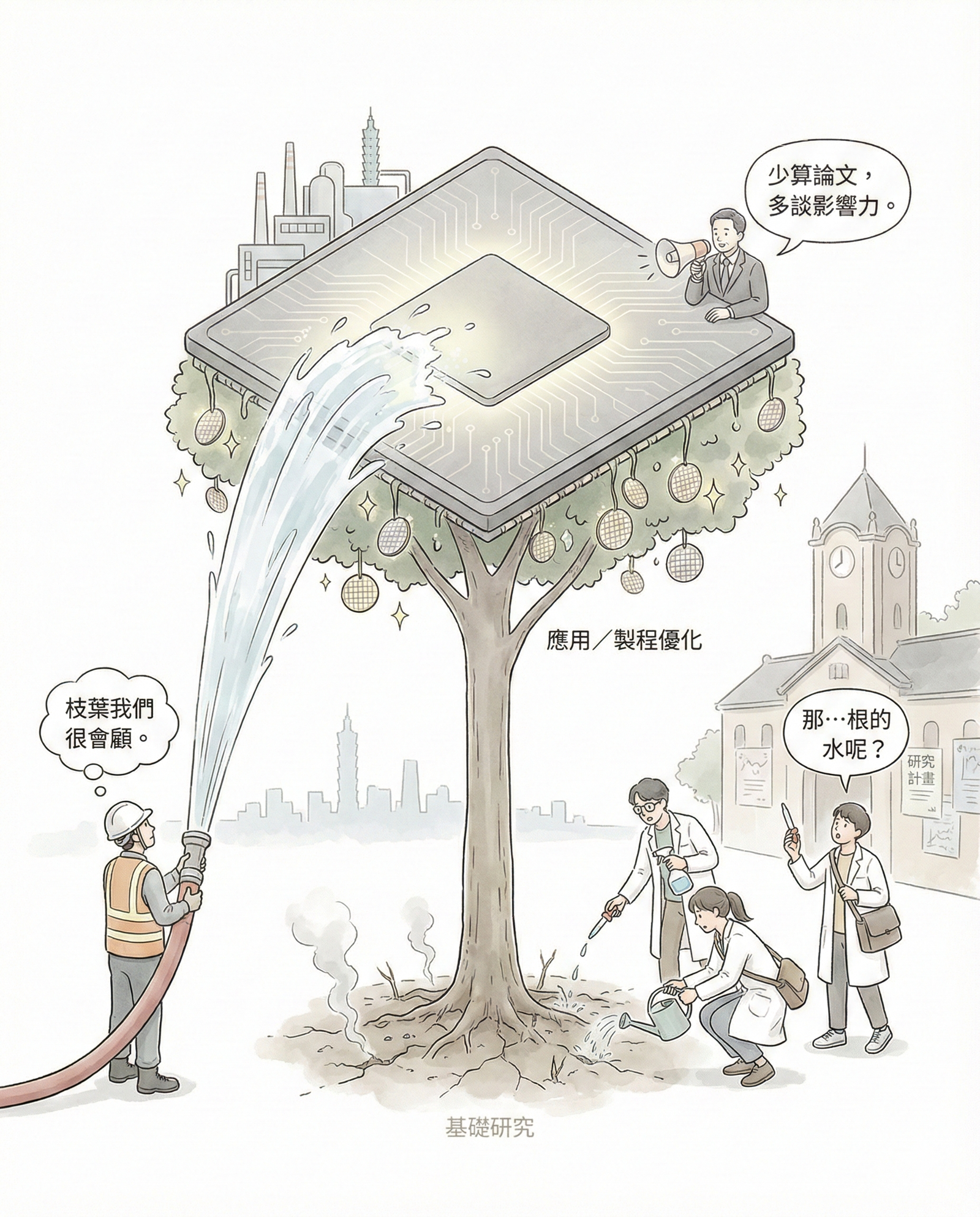 把世界級當口號很容易,把世界級需要的制度與資源建立起來才困難。台灣科技主管若真在意世界級影響力,更需要直視這個投資結構,而不是把壓力全部轉成對學界的道德訓話,彷彿只要大家再努力一點,資源就會自己從天上掉下來。當然,論文不該是唯一目標;但我們也必須承認,穩定的研究人力、經費與時間,是產生高品質成果的必要背景。台灣的基礎研究仍處在量能不足的階段;在這個階段喊「少算論文、多談影響」,若沒有相稱投資,只會變成另一種形式的指標轉移,從 KPI 換成影響力 KPI 罷了。