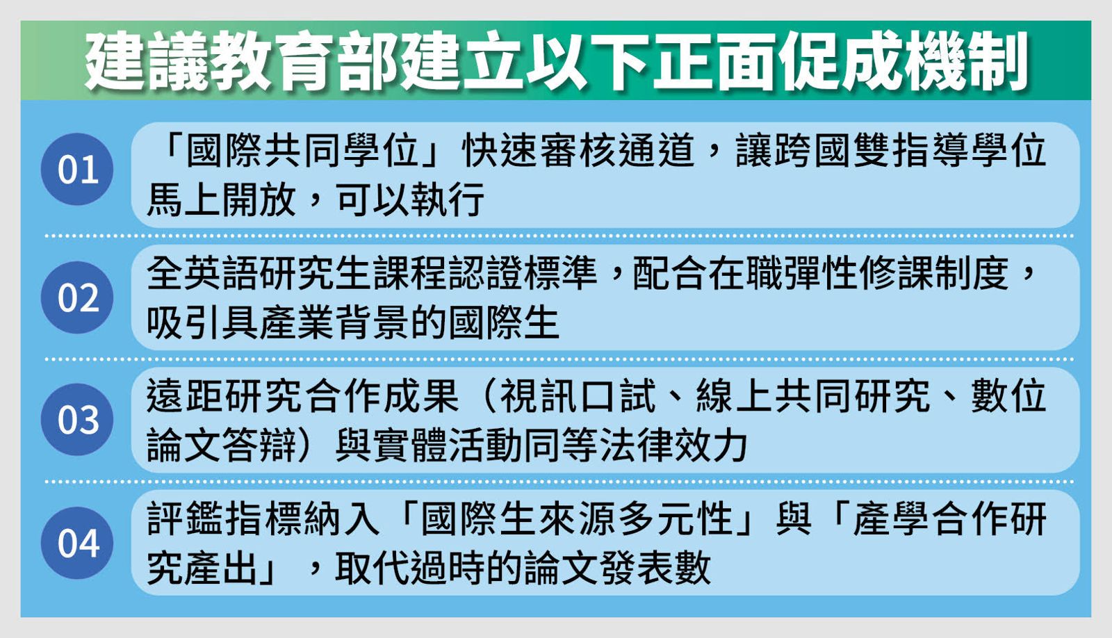 建議推動「精熟能力制」改革,以能力認證取代學分門檻。大幅增加「產業博士」比例,要求論文成果對應真實問題:一個AI醫療應用、一套政策模擬,或一項可驗證的社會影響力實踐,都應被納入正式學術成果。博士生應強制參與跨學科專案,學習向企業主、投資人、政策制定者傳遞研究價值——這才是AI無法取代、台灣卻長期忽視的競爭優勢。