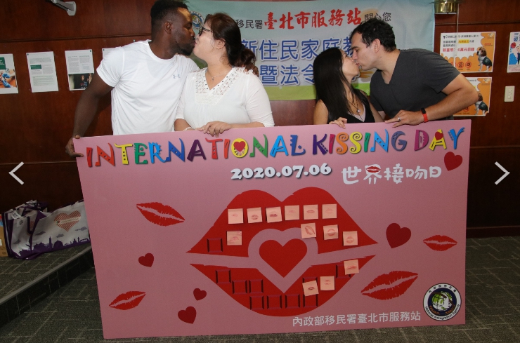 為使新住民適應來臺生活,同時對居停留法令、衛生保健、就業資訊等資訊進行介紹,移民署臺北市服務站舉辦新住民家庭教育課程,並連結「世界接吻日」的方式,讓課程更豐富有趣,除了讓異國戀情新婚夫妻們更深入貼近彼此的文化之外,也使初次入境的新住民朋友們更能了解臺灣生活。