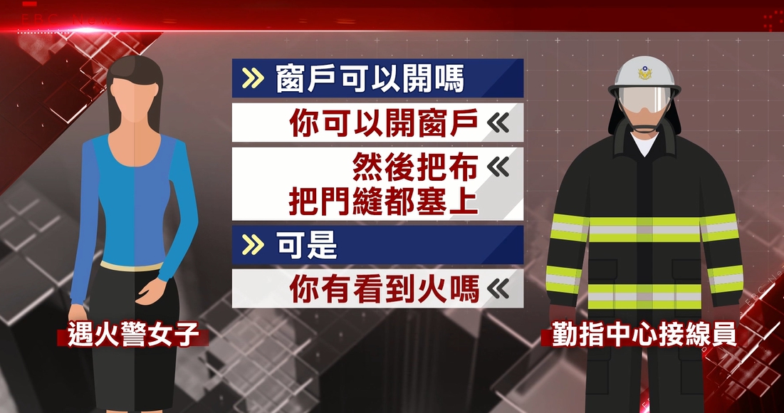 接線員一面安撫,一面請女子回報狀況,並持續跟女子保持通話,一直到消防人員到場。接線員:「窗戶可以開嗎,你可以開窗戶,然後把布把門縫都塞上。」
