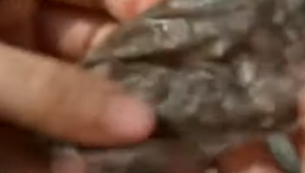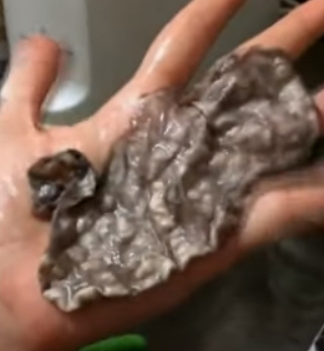 左手掌攤直,濕黏且發霉,略顯乳白色的物品約莫整個手掌大,看起來疑似是作業用手套。丁小姐表示「我覺得我心裡很創傷,因為我昨天真的恐慌症差點發作,真的是一直心跳很快,覺得我喘不過氣,然後整個狀態都很差。」