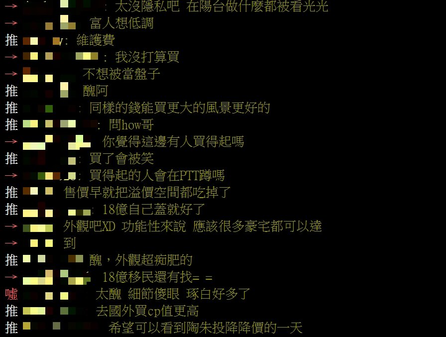 這篇貼文也迅速引起網友們熱議,就有許多網友紛紛分析原因,「太沒隱私吧,在陽台做什麼都被看光光」、「同樣的錢能買更大的風景更好的」、「外觀吧,功能性來說,應該很多豪宅都可以達到」、「18億把錢分開買都比單買陶朱爽吧」、「壁刀煞的格局吧,生意人很忌諱」、「看起來超像螺旋靈骨塔」、「太前衛太高調」、「這麽有錢的通常都馬注重隱私及安全,越低調越好,這住進去不被挖的一乾二凈才怪」。