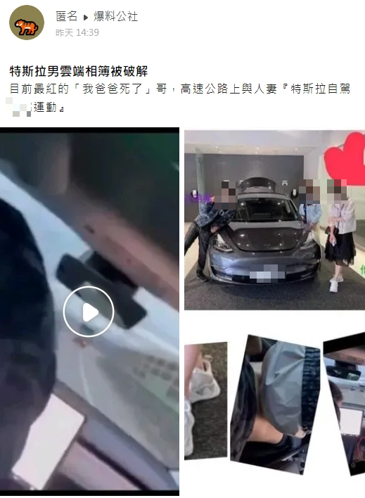 近日臉書「爆料公社」瘋傳一段8秒影片,標題寫著「特斯拉男雲端相簿被破解」,發文人也影射「這是目前最紅的『我爸爸死了』哥,高速公路上與人妻『特斯拉自駕OO運動』」,從影片中可以看到一名男子在高速公路上開啟「Autopilot 自動輔助駕駛」,並坐在駕駛座和一名女子交戰。影片曝光後,不少網友紛紛開始與林男平時的生活照對比,發現林男在交車時穿名牌外套,穿在片中女子身上,還有人從鞋子分析出女子的身分。