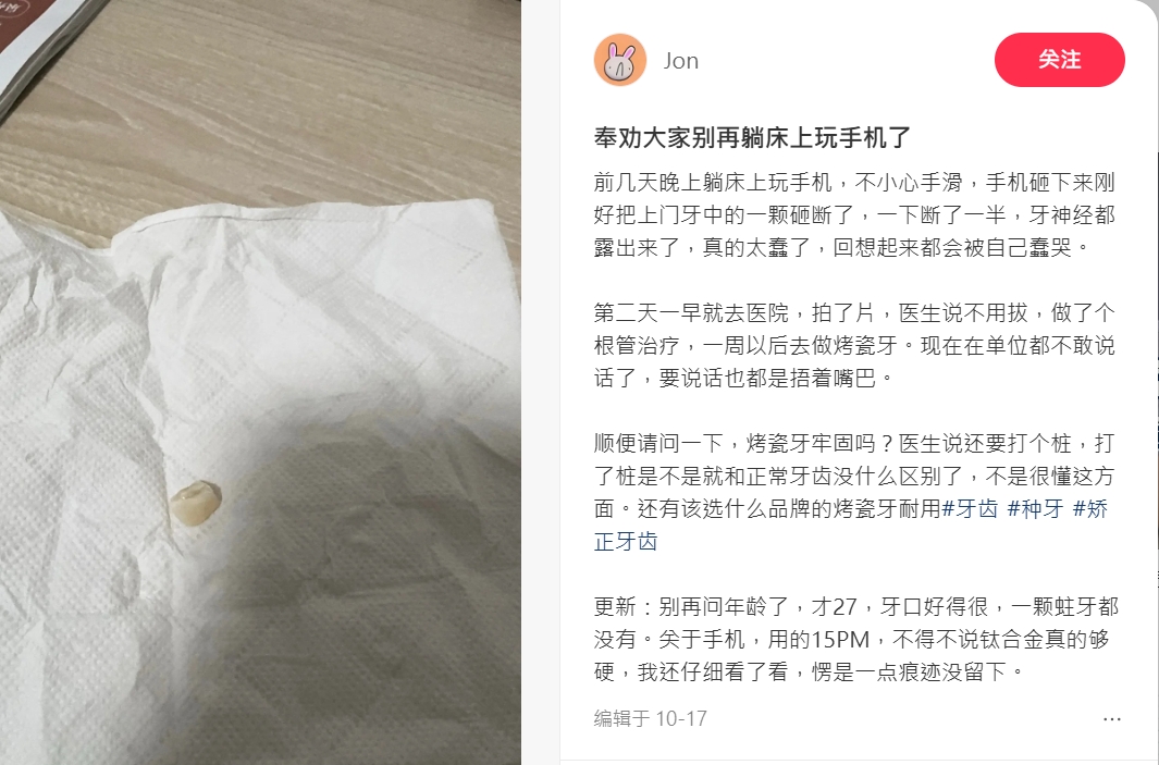 在小紅書一名男子發文「奉勸大家別再躺床上玩手機了」,他透露事發後第二天一早便緊急到醫院就診,經檢查後確認牙齒斷裂嚴重但無需拔除,醫生為他進行了根管治療,並建議一週後進行烤瓷牙修復。他表示,目前的自己少了半顆門牙,覺得非常丟臉,說話時需用手遮嘴,在公司同事面前更是不敢大聲說話。