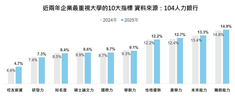 104人力銀行職涯教育長王榮春指出,企業最重視大學品牌力的前四大指標為:14.9%職務能力、13.3%未來能力、12.7%產學力、12.2%性格優勢。其中職務能力、未來能力、性格優勢三項為軟實力,培養時間較長;產學力則屬硬實力、培養時間較快。大學或研究所僅是三十年職涯生涯的一小段,企業更重視透過軟實力驅動大學畢業生長期發展個人品牌力,進入職場也更能快速適應職場,做中學厚植硬實力。