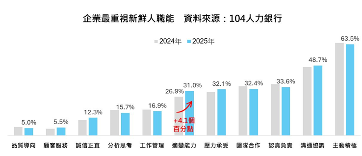 挑選學校培養未來「職」戰力!104人力銀行連續第2年發布《大學品牌力》報告,企業最重視大學畢業生的前四大指標和去年相同,仍為:職務能力、未來能力、產學力與性格優勢。其中,隨著AI飆速發展,職務能力中的「適變能力」、未來能力中的「復原力與自我調節」及「數位素養」受企業重視程度都比去年提升。如何擁抱科技,並培養情緒智商,已成新一代大學畢業生必須具備的核心能力。