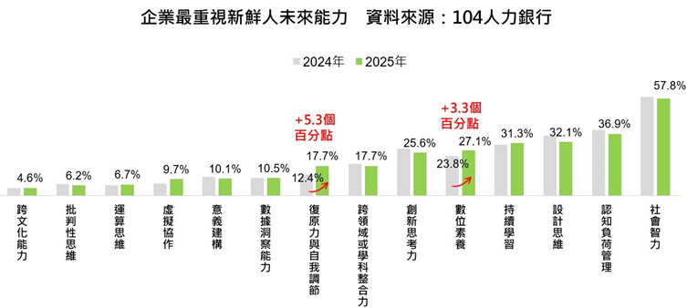 企業重視未來能力,對「復原力與自我調節」、「數位素養」重視程度提高