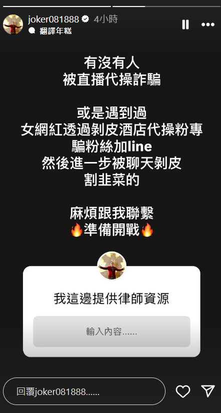 勾惡則於今(23日)PO出疑似是回應這起事件的限時動態,表示要徵集直播代操詐騙受害人、或是女網紅透過剝皮酒店代操粉專騙取粉絲加Line聊天,進而割韭菜的受害者與他聯繫,他提供律師資源,文末還附上兩個火焰符號,與「準備開戰」字樣,像是要準備開始反擊。