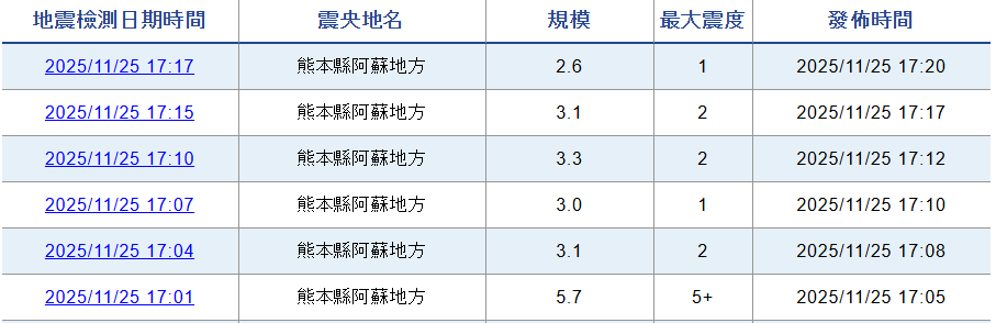 今(25)日日本熊本縣在當地時間18時01分發生芮氏規模5.7地震,震央位於熊本縣阿蘇,北緯33.0度、東經131.1度,地震震源深度為10公里,屬於極淺層地震,最大震度5強。