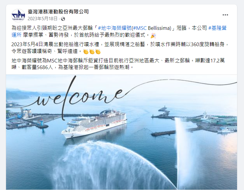 台灣港務公司統計,2023年國際郵輪預報共327艘次,母港航線為164艘次;2024年國際郵輪預報共482艘次,母港航線共330艘次,以基隆或高雄為母港航線的郵輪,包括:歌詩達郵輪、名勝世界郵輪、挪威郵輪及地中海榮耀號。