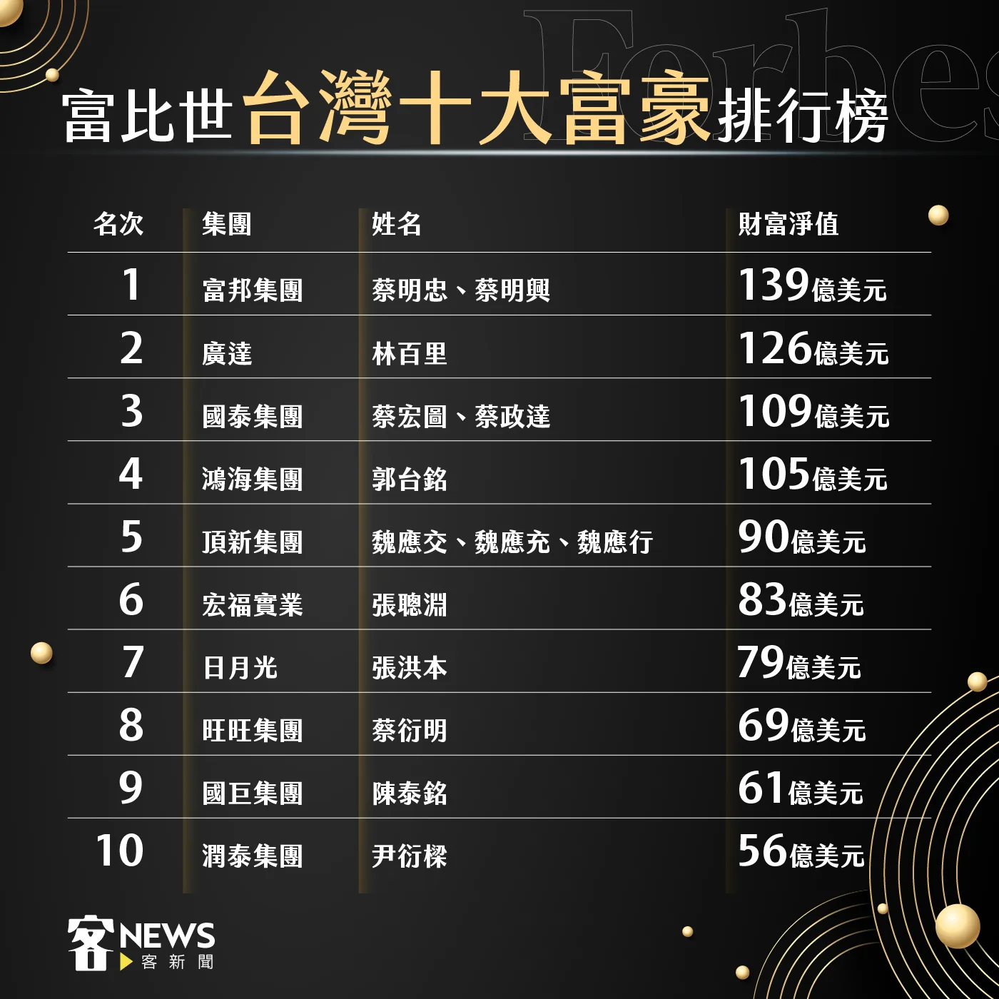 【要聞中心/綜合報導】根據美國雜誌《富比世(Forbes)》今天(5日)公布的2025年台灣50大富豪榜,富邦集團董事長蔡明忠與富邦金控董事長蔡明興兄弟,財富增加32億美元、財富淨值至139億美元,一舉奪回榜首。