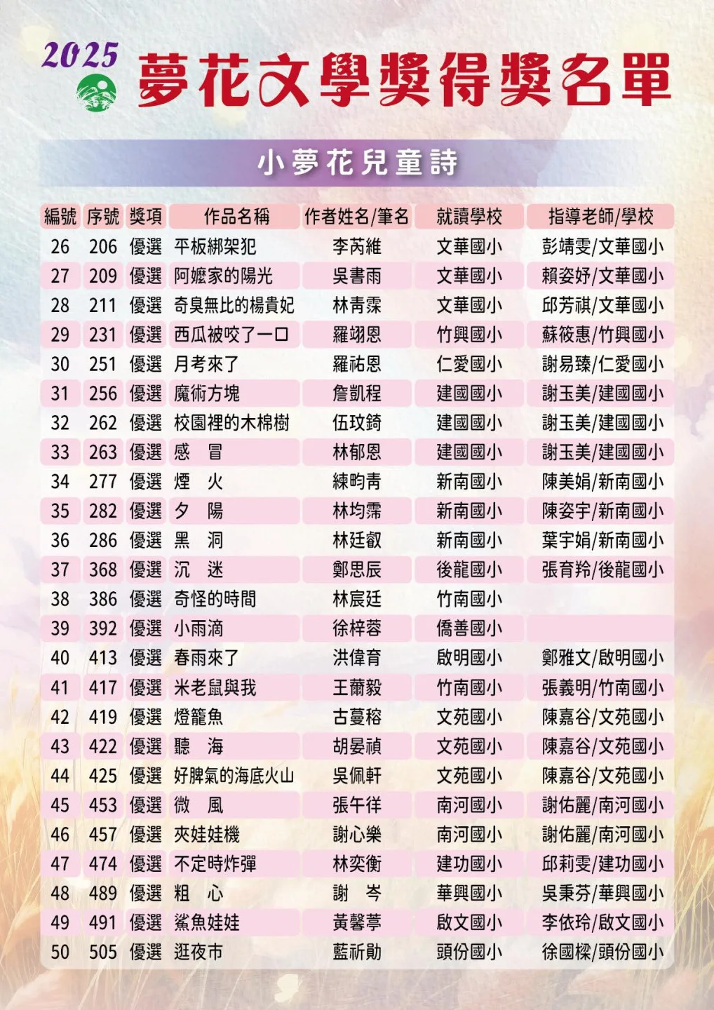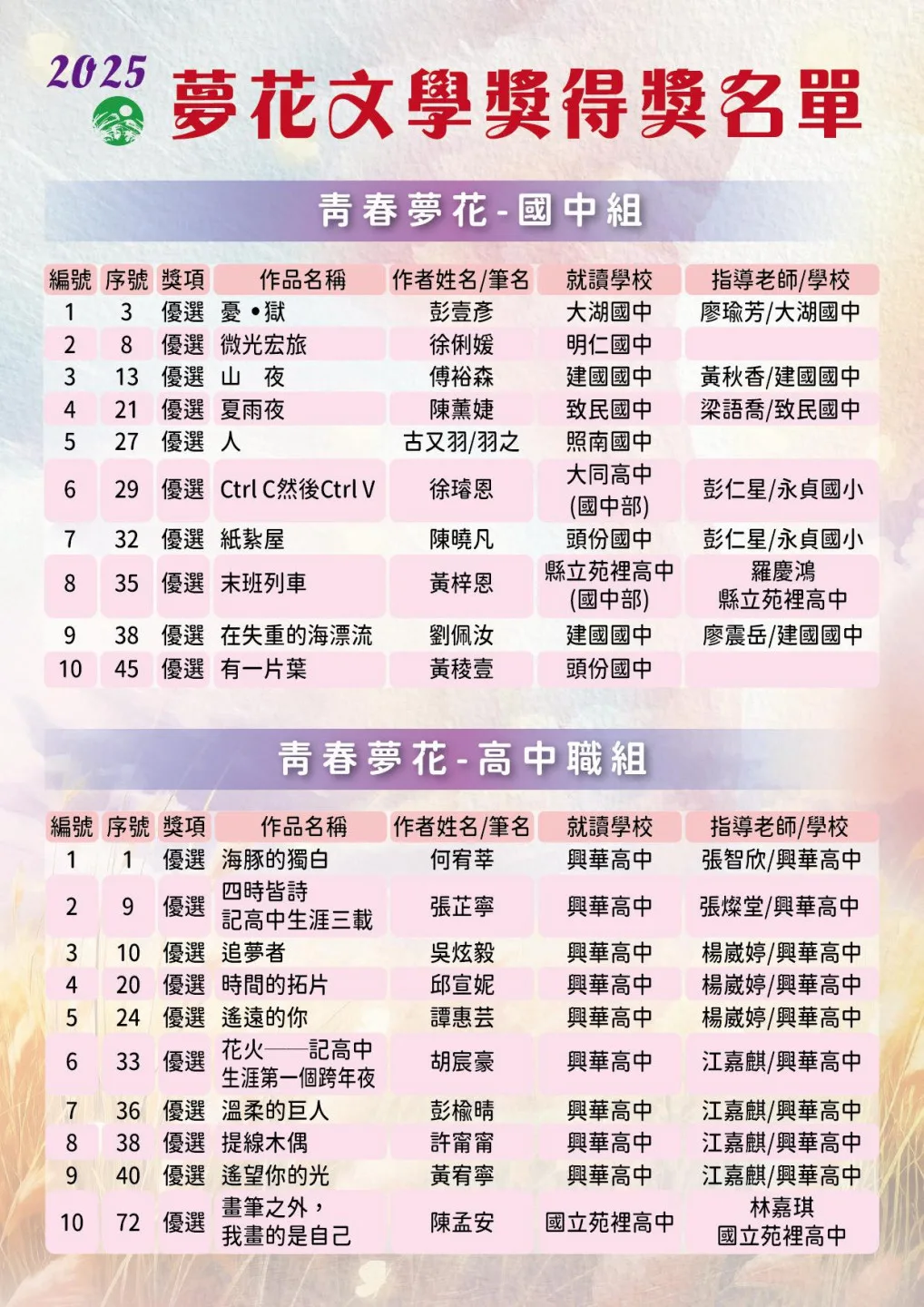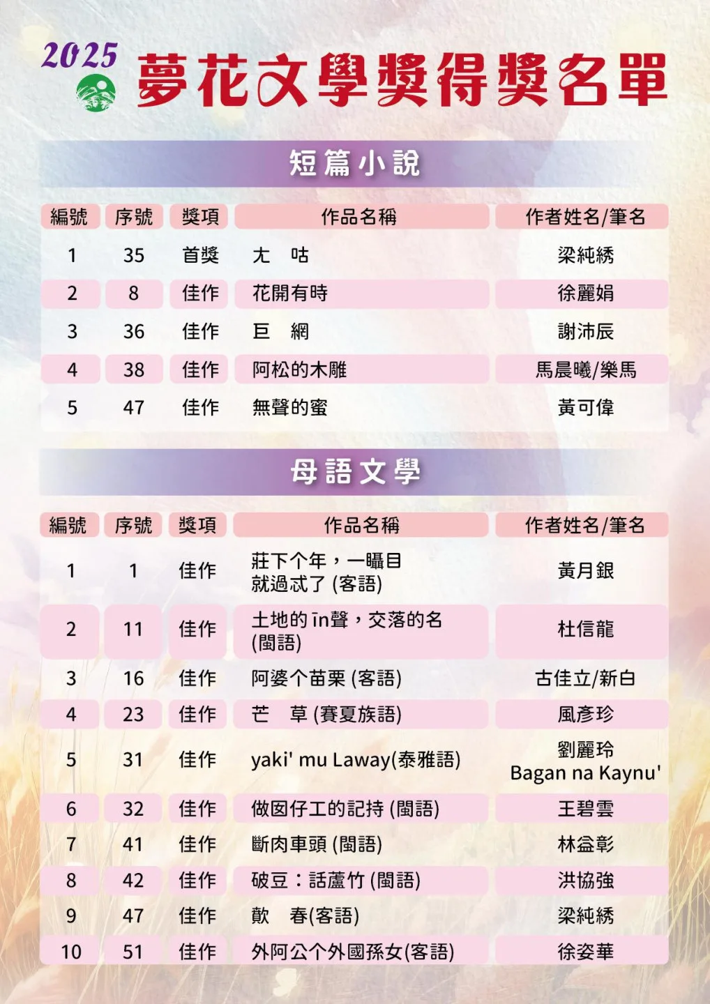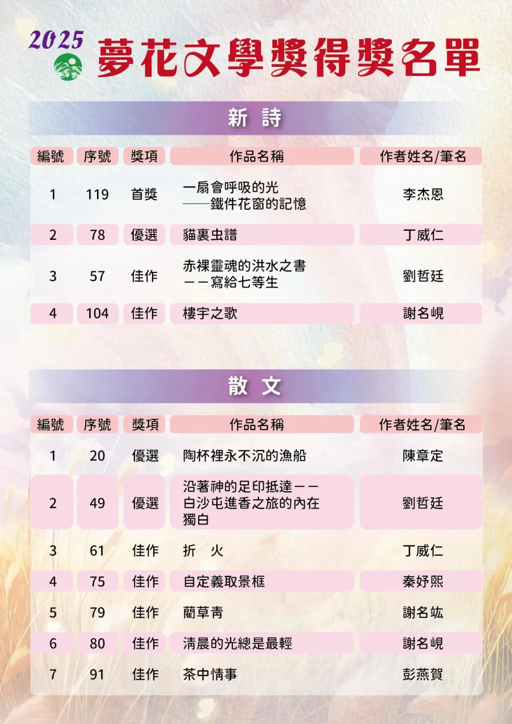 今年更出現4位「雙料得主」—丁威仁、劉哲廷、謝名峴分別獲得新詩與散文的優選或佳作,梁純綉則勇奪短篇小說首獎及母語文學佳作。