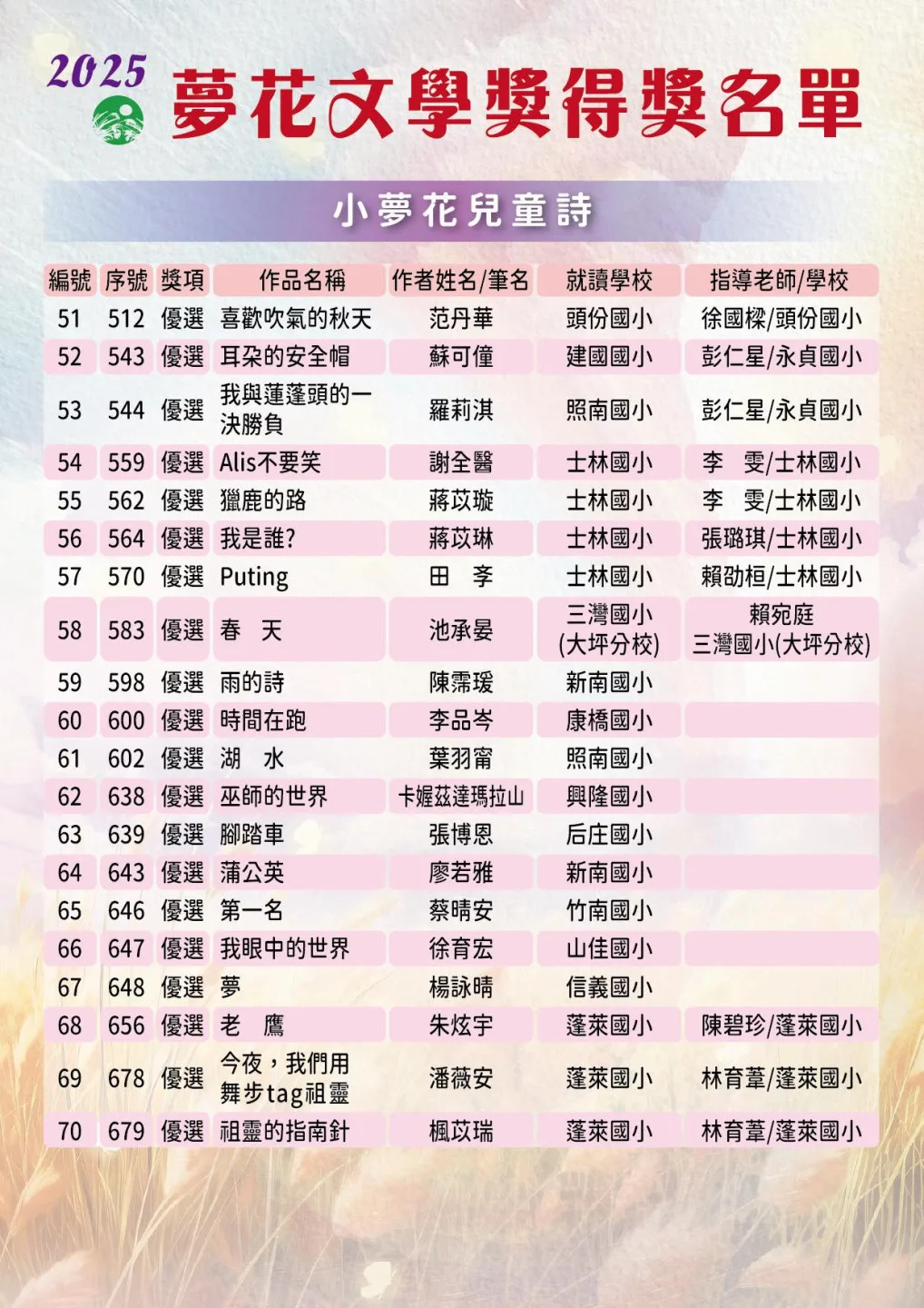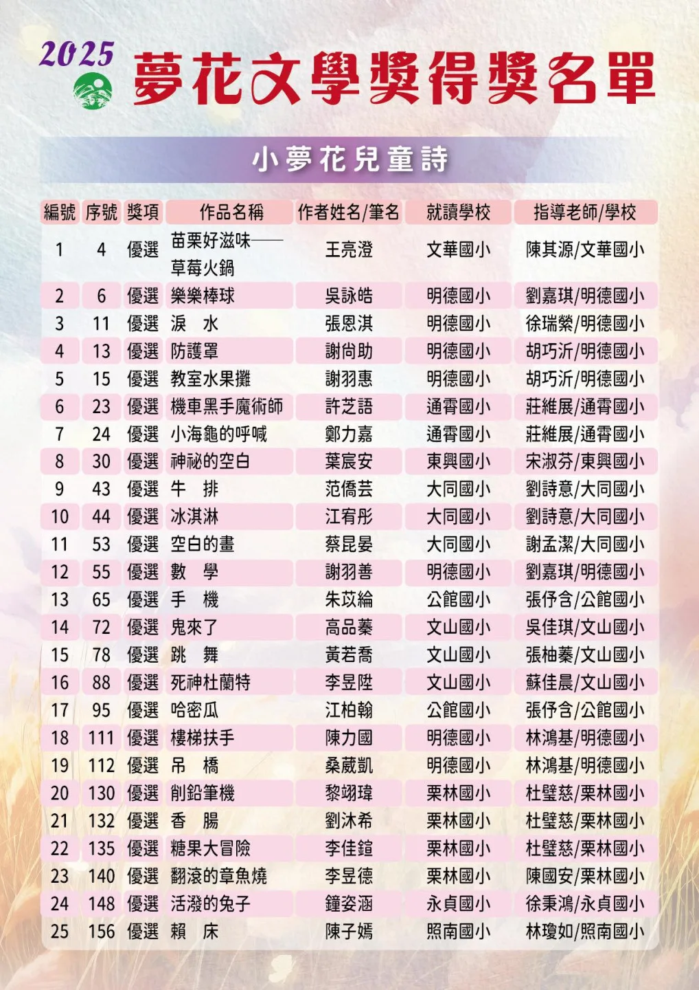 夢花文學獎今年邁入第28年,今年共收稿計1132件,經嚴選後,有116件作品獲獎。得獎專輯含:新詩、散文、短篇小說、母語文學、青春夢花及小夢花兒童詩等6類組作品集結成冊,會中分別頒發首獎、優選、佳作的獎金與獎牌;首獎獎金5萬元、優選獎金3萬元、佳作獎金1萬元及青春夢花優選每人獎金5千元、小夢花優選每人獎金2千元,總獎金64萬元。