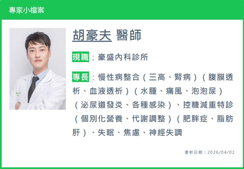 內科診所院長胡豪夫表示,當慢性腎臟病患者的狀況已變成需要進入腎臟替代療法時,醫療團隊會向患者說明腹膜透析與血液透析的差異,包括治療頻率、生活型態影響與可能風險,並綜合評估患者身體狀況與家庭支持條件,再由患者選擇符合自身需求的治療方式,這也是臨床上常見的醫病共享決策方式。