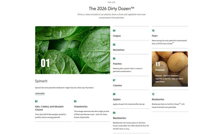「最髒12」榜單中包含農藥殘留最嚴重的作物,依序為菠菜、羽衣甘藍與芥菜類、草莓、葡萄、油桃、桃子、櫻桃、蘋果、黑莓、梨子、馬鈴薯與藍莓。指南表示,該榜單中的蔬果高達96%有農藥殘留,平均每個樣本含4種以上農藥,總計檢出203種農藥。