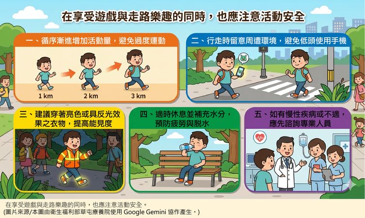 此外,在享受遊戲與走路樂趣的同時,也應注意活動安全: