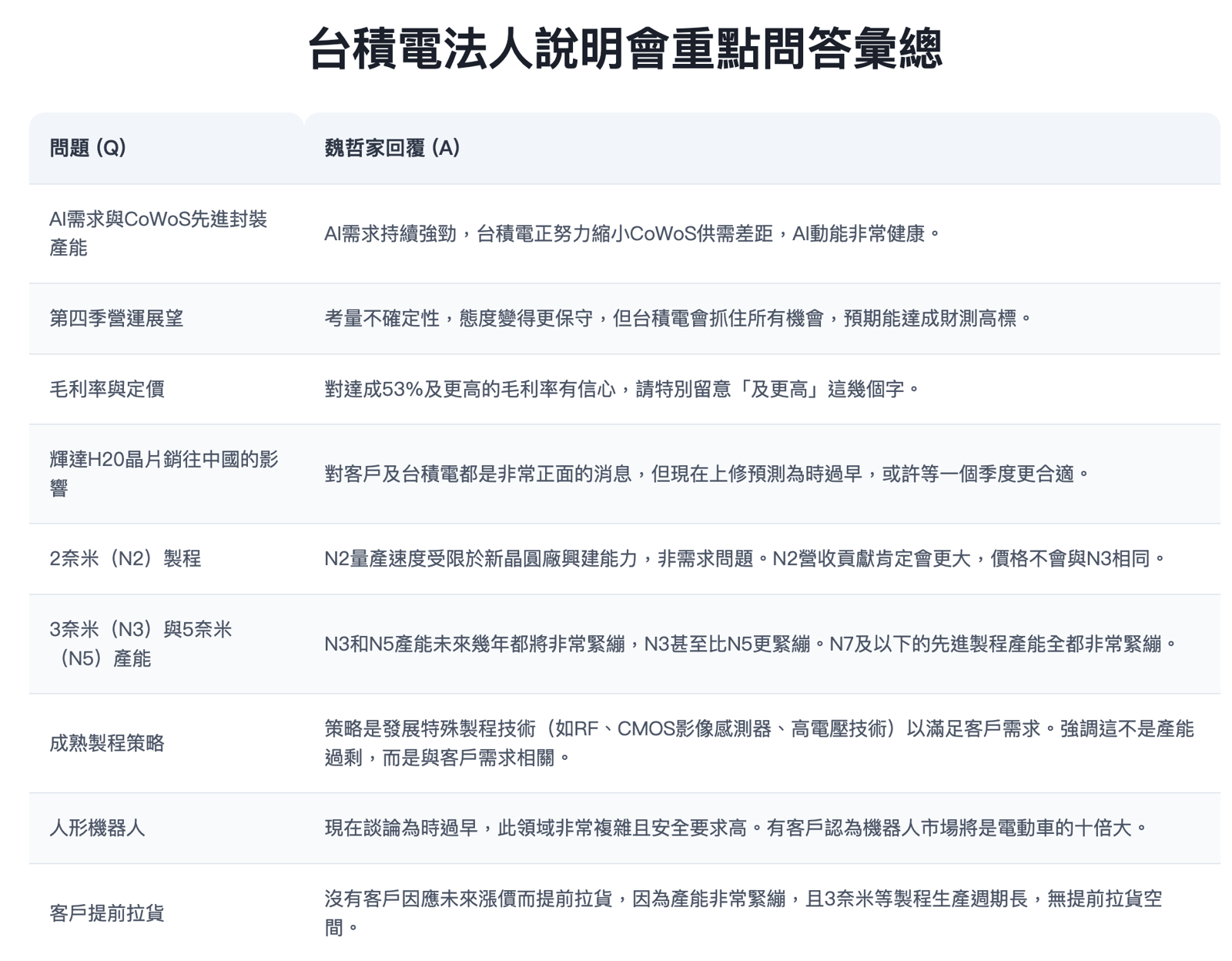 面對地緣政治與匯率等外部挑戰,台積電也說明應對方式。在日本和德國等地設廠,是為了滿足客戶在特殊製程上的需求,並不會造成產能過剩。儘管海外設廠及不利匯率帶來成本壓力,但公司透過包含定價、成本控制、營運效率等在內的方式來應對。因此,管理層重申,達成「53%及更高」的長期毛利率目標依然是可實現的。