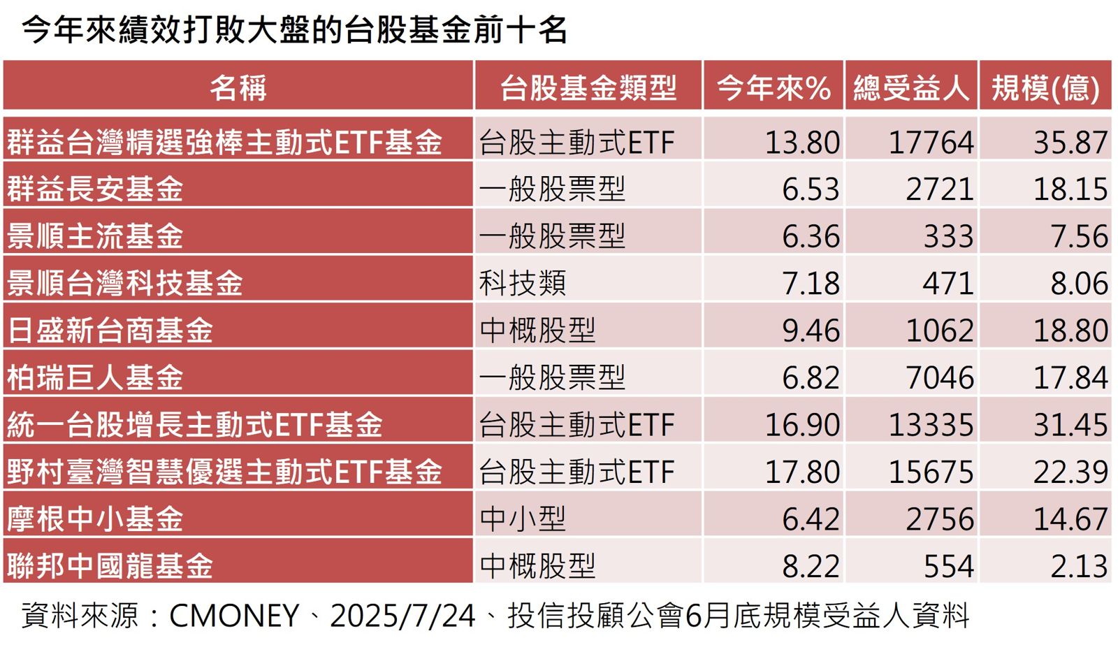 主動式台股基金與被動式台股基金的最大差異,在於前者由專業經理人主動選股、調整持股,目標是「打敗大盤」;後者則依指數權重被動買股、追蹤大盤。相對地,主動式基金須負擔較高費用,績效好壞也更仰賴操盤手功力。而目前十名的主動式台股基金為:群益台灣精選強棒主動式ETF基金、群益長安、景順主流、景順台灣科技、日盛新台商、柏瑞巨人、統一台股增長主動式ETF基金、野村臺灣智慧優選主動式ETF基金、摩根中小基金、聯邦中國龍。