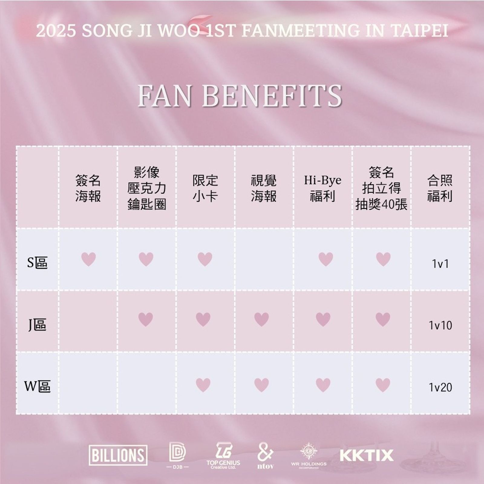 粉絲福利部分,除了全場觀眾皆可參與「簽名拍立得抽選活動」和「Hi-Bye福利」並獲得「限定小卡」之外,S區的粉絲可獲得親筆簽名海報、影像壓克力鑰匙圈,並享有與宋知佑1對1合照;J區的粉絲則可獲得壓克力鑰匙圈、視覺海報以及參與1對10合照;W區的粉絲可獲得視覺海報和參與1對20合照,讓所有粉絲留下與宋知佑的專屬幸運回憶。「SONG JI WOO 1ST FANMEETING IN TAIPEI - The First Letter」門票從新台幣1240元至4880元不等,5月5日(一)晚上6點在 KKTIX、全家便利商店 FamiPort 正式開賣,詳洽主辦首湛創意官方 FB 和 IG 。