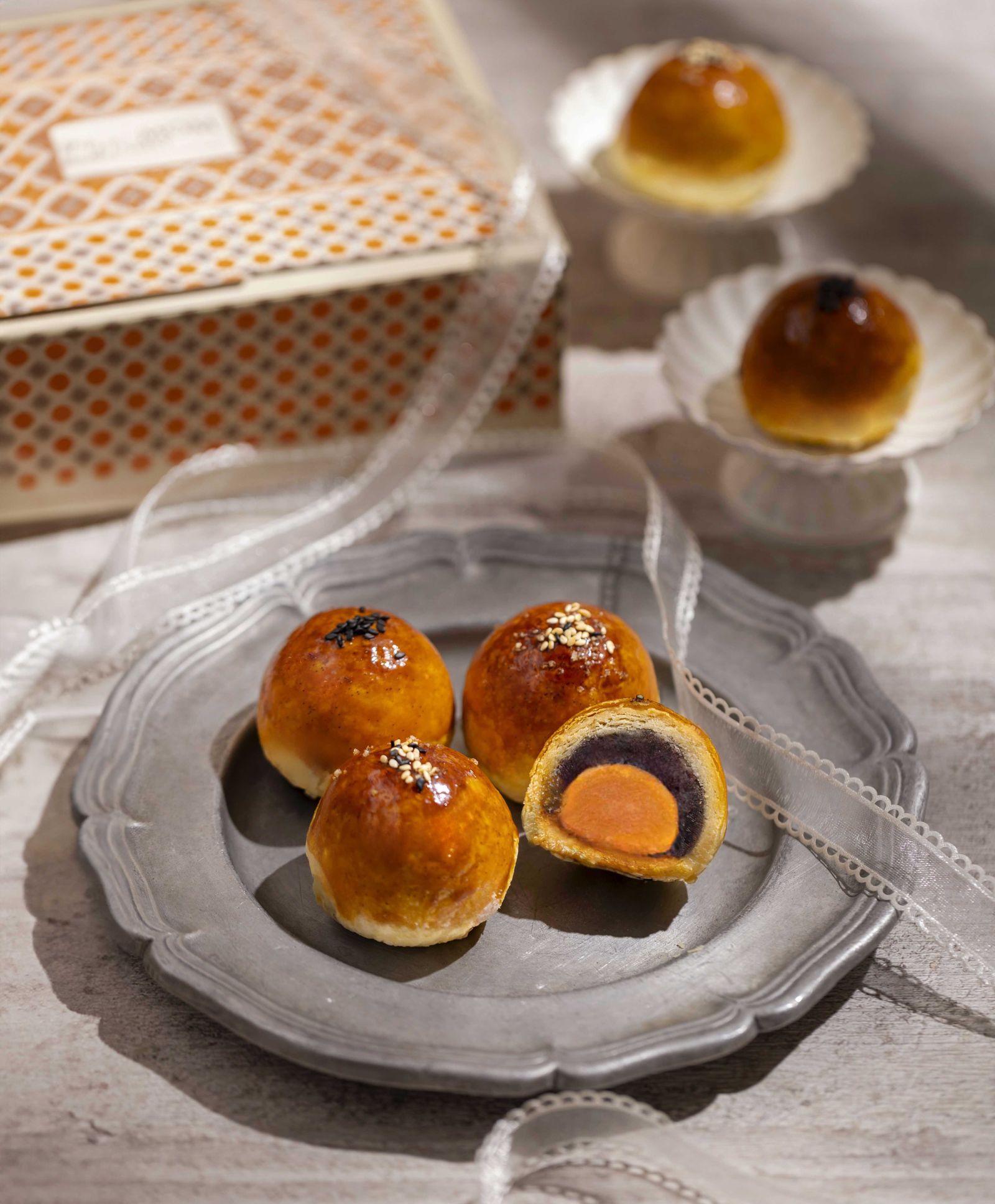 內餡部分則延續傳統紅豆與棗泥兩款基底,加入風味溫潤的日本和三盆糖調甜度,再包裹足足醃漬28天的鹹鴨蛋黃。紅豆口味表面撒上鹽之花提升豆香,棗泥版本則以黑白芝麻提味,兩款外觀相似,入口風味截然不同。