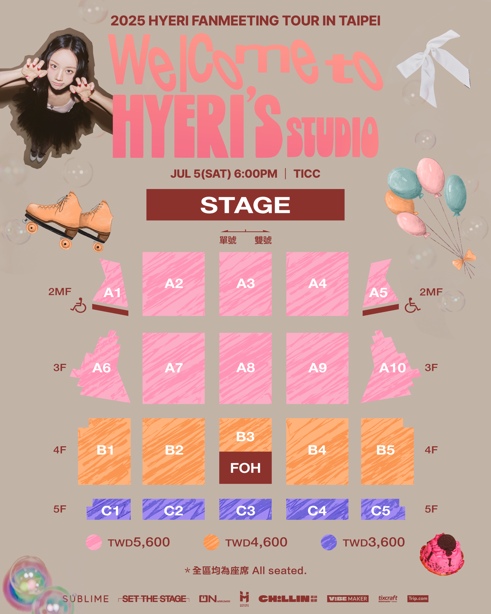 惠利的見面會「2025 HYERI FANMEETING TOUR <Welcome to HYERI’s STUDIO> IN TAIPEI」門票將於 5 月 17 日上午 11 點在拓元票系統網站開賣,採實名制售票,票價為 A 區 TWD 5,600 / B 區 TWD 4,600 / C 區 TWD 3,600 ,所有購票者皆可參與 HI-BYE 、獲得一張官方海報,並擁有 1:20 團體合照及親簽海報的抽獎資格,A 區可獲得三張限定小卡,B 區可獲得兩張限定小卡,C 區則會獲得一張限定小卡。詳洽希林國際 Chillin International 粉絲專頁。