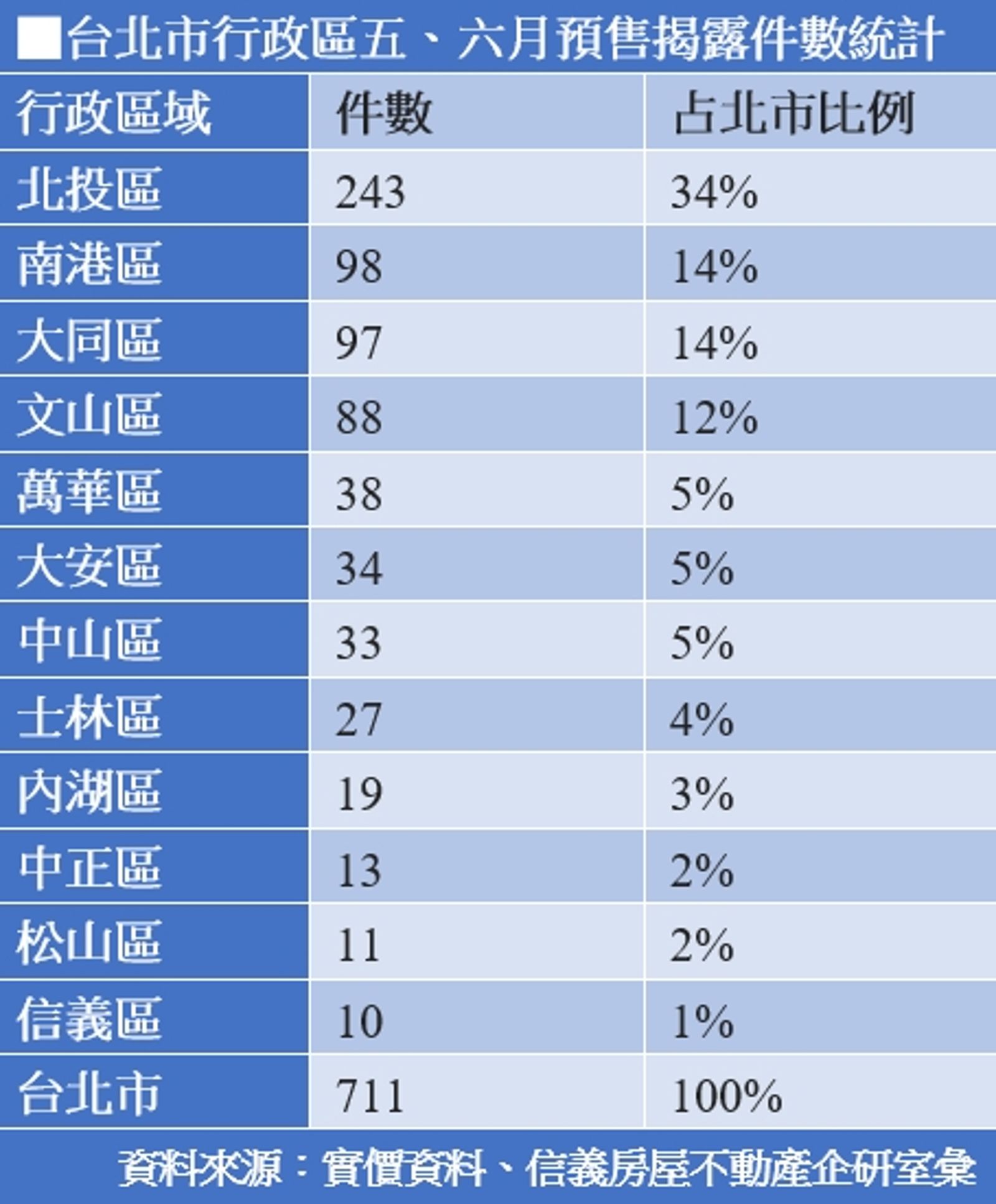信義房屋不動產企研室專案經理曾敬德透露,台北市5、6月這兩個月揭露的預售711戶,就有高達34%出現在北投區,其次是南港的98件、大同區的97件、以及文山區的88件,反觀市中心區域的預售揭露狀況就有點冷。