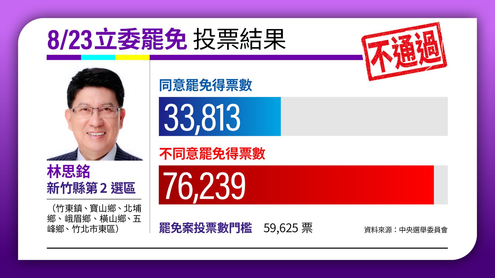 國民黨立委林思銘挺過罷免,顯示他在民進黨、時代力量的地方勢力夾擊下,仍能繳出亮眼成績,順利通過「新竹縣長模擬考」。雖林思銘是否能問鼎新竹縣長大位,仍有待黨內布局,但能夠有效整合藍白支持者,並奠定在野合作氣氛,無疑將成林思銘的最強籌碼。