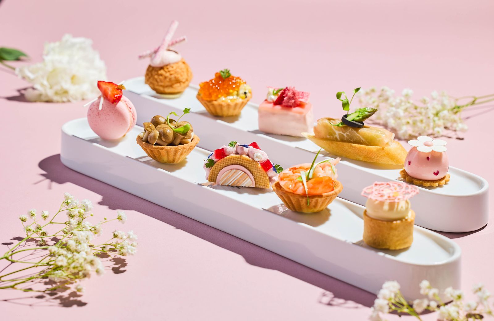 6款「拾光甜品」有葡萄柚多多、草莓優格泡芙、莓美覆盆子塔、玫瑰馬卡龍、洛神圓舞曲、粉紅蜜桃慕斯,以多種水果展現輕盈的蜜意,另外還會提供2杯義大利氣泡酒及飲品。適合這週末母親節帶媽媽慶祝,也可約三五姐妹淘來場質感午茶聚。