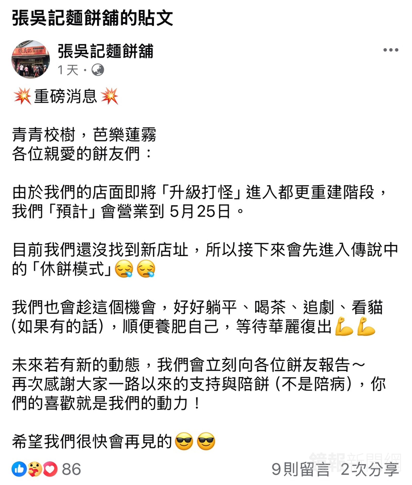 老闆在臉書上寫到,店面即將進入都更階段,預計營業到5月25日。因為還沒找到新店址,會進入「休餅模式」,趁此機會躺平、喝茶、追劇、看貓,順便養肥自己,若有新動態,會立刻跟餅友報告