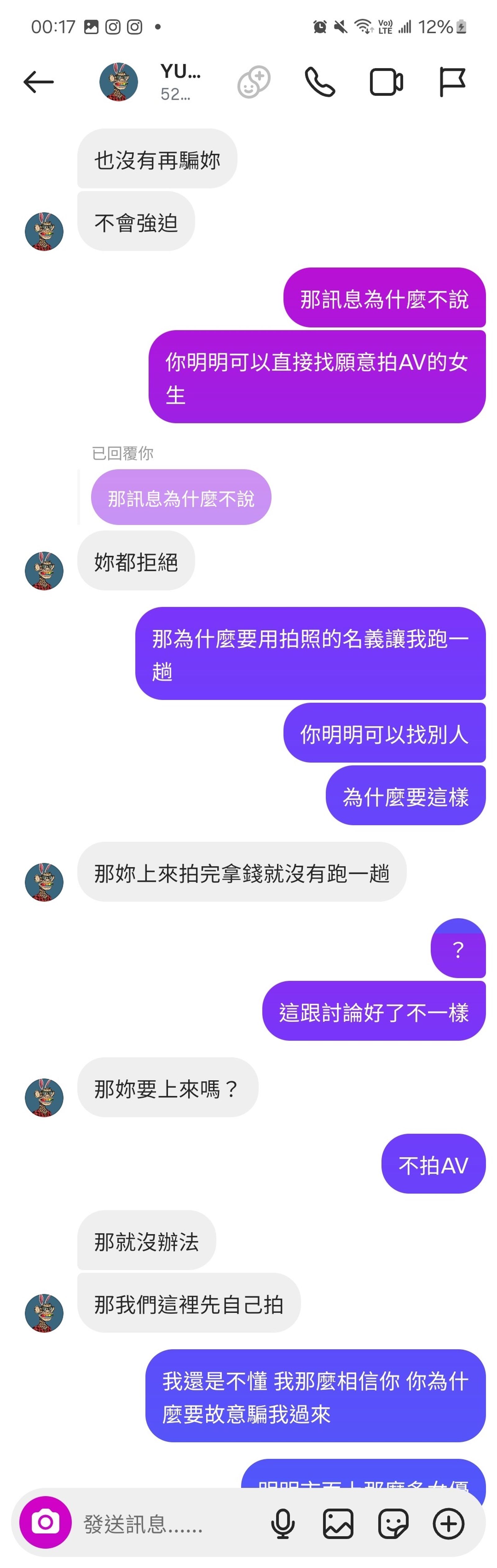 樂樂公開雙方對話截圖,內容觸目驚心。對方先傳訊:「等一下上來,直接拍AV可以嗎?我們沒有要拍什麼照片,我們準備好了,只剩妳上來洗完澡、畫完妝,開拍。」樂樂當場拒絕,回覆:「不可能,從頭到尾我都沒有說要拍AV!」對方卻不死心,不斷催促「妳要上來嗎?」甚至喊價:「上來拍完可以拿5萬元,如果不行,我就匯1萬5千元補償。」
