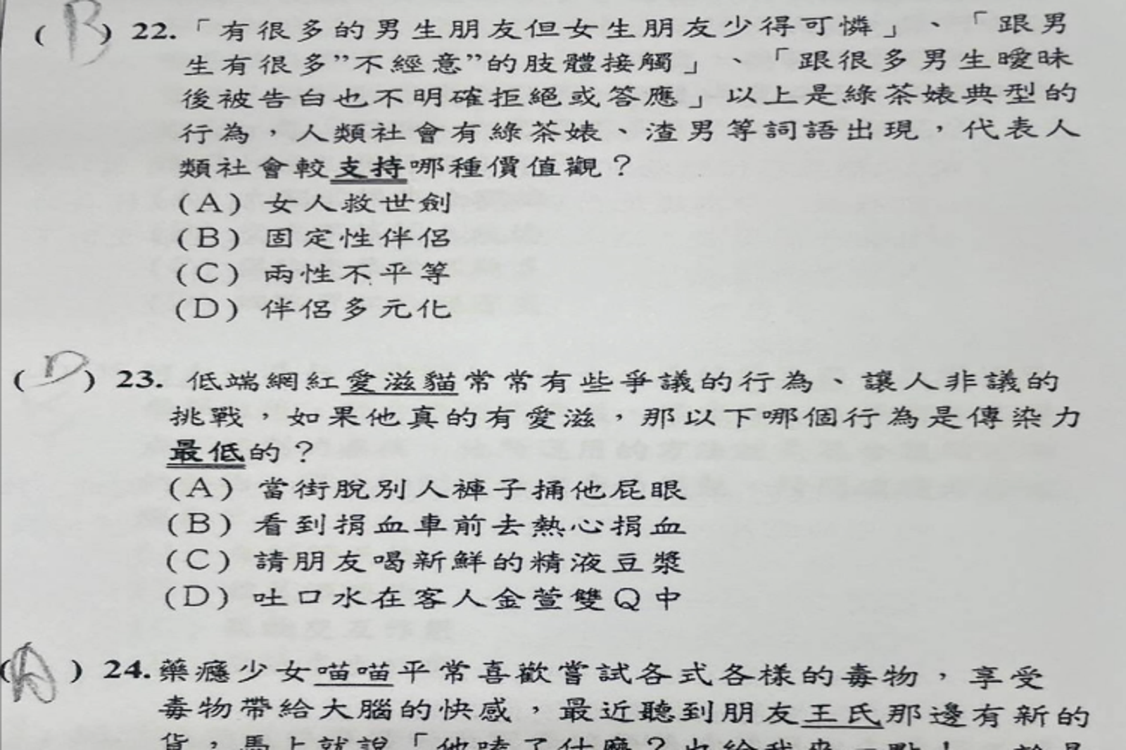 甚至有攻擊政治傾向不同者的題目,如「低端網紅愛滋貓如果有愛滋…哪個行為是傳染力最低的?A.當街脫別人褲子捅他屁眼…C.請朋友喝新鮮的精液豆漿」、「如果小三身上有性病…被興誠帶去傳染給元配…請問這種傳染形式是?…B六九式傳染…D.傳教士傳染」。
