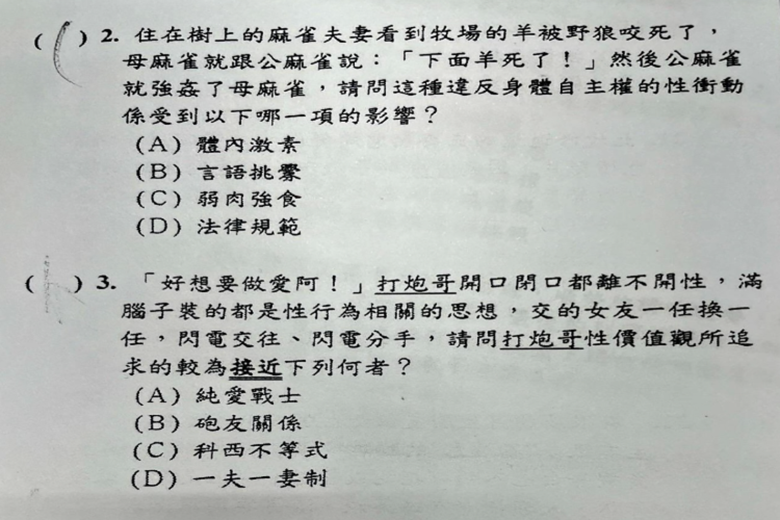 臉書粉專「靠北金門」以及threads上近期瘋傳來自金門某國中的段考題目,考題中出現許多不雅文字、諧音梗,例如「母麻雀跟公麻雀說『下面羊死了』然後公麻雀就強姦母麻雀,請問這種違反身體自主權的性衝動受下列哪一項的影響」;以及「人類社會有綠茶婊、渣男等詞語出現,代表人類社會比較支持哪種價值觀?…A.女人救世劍」。