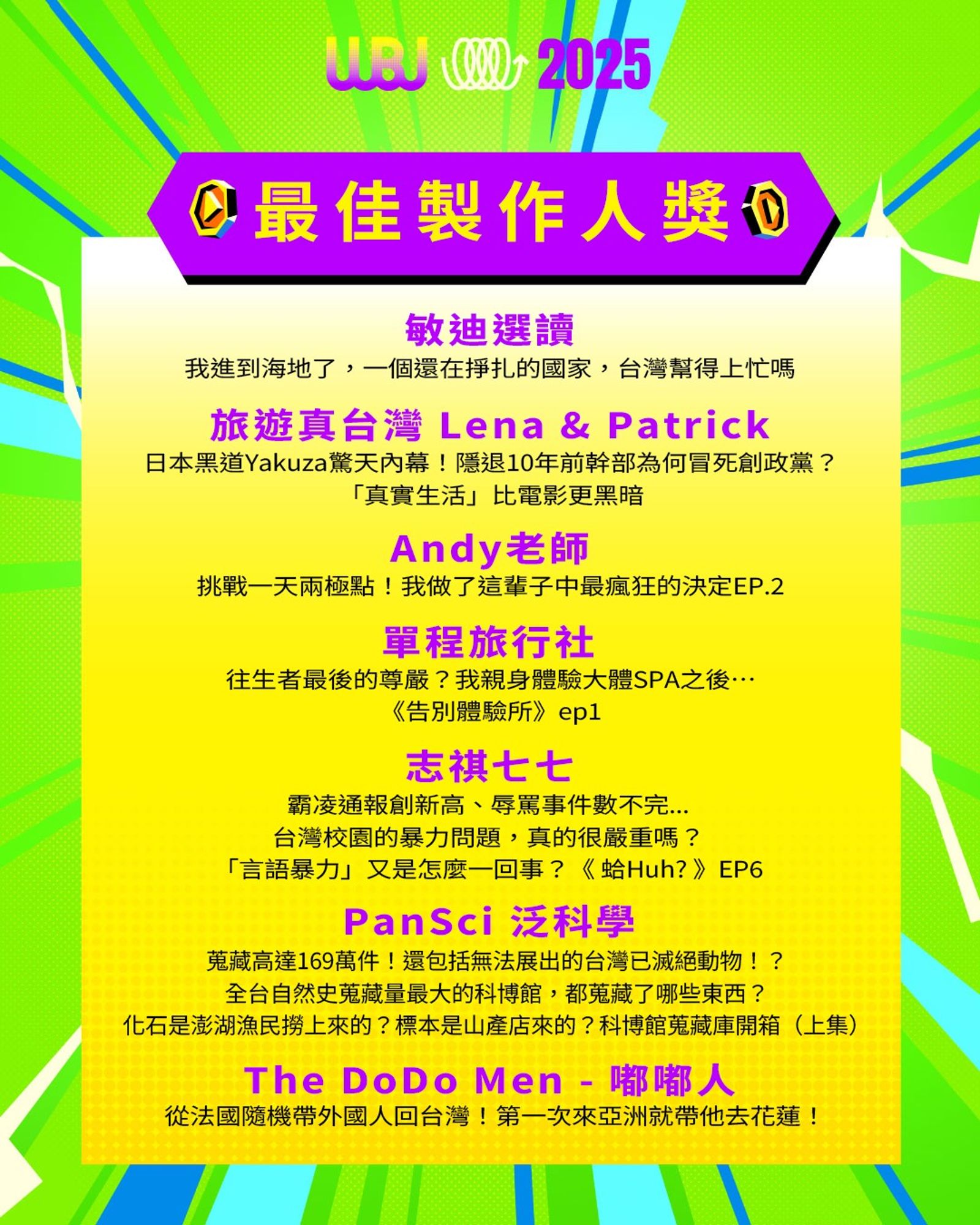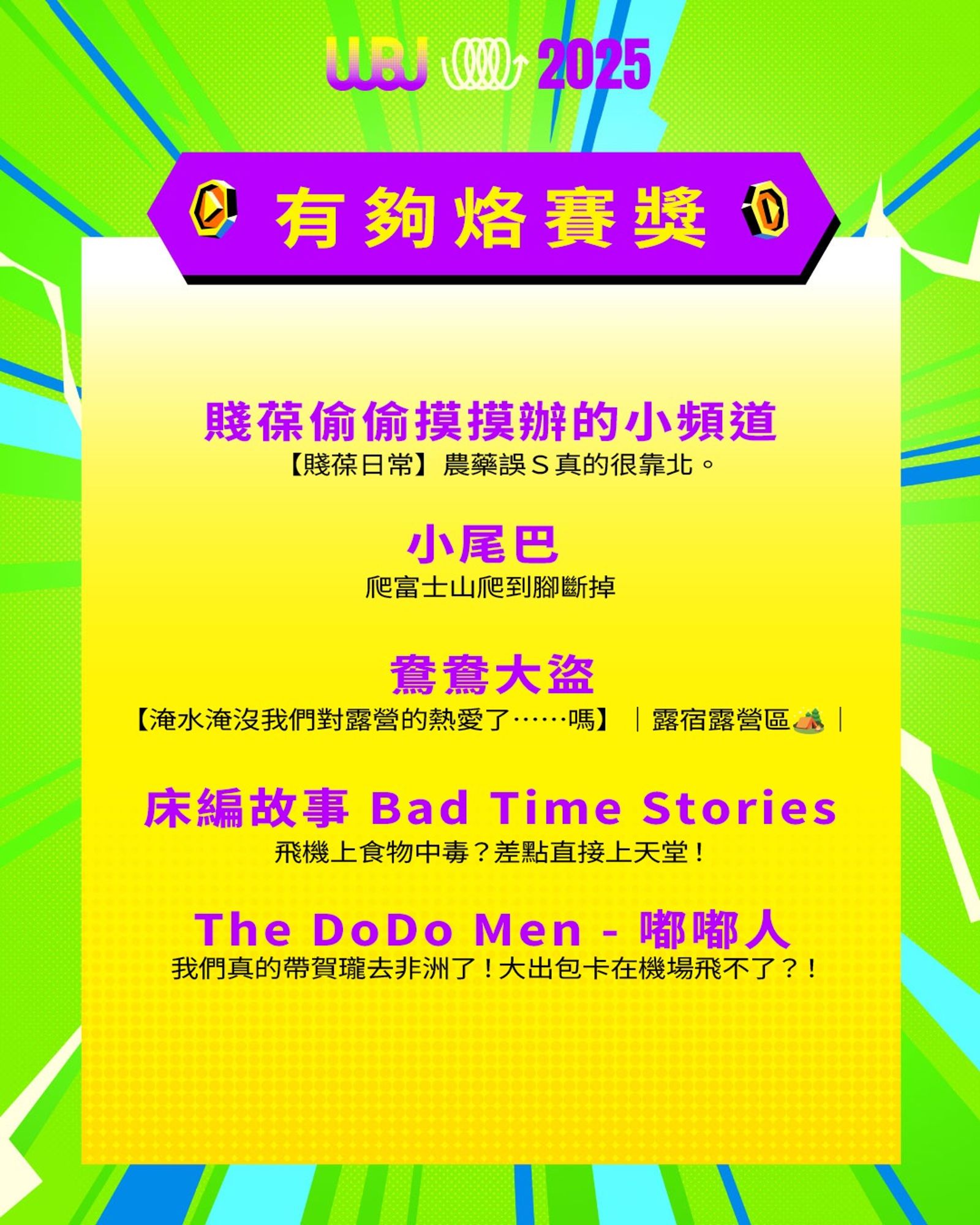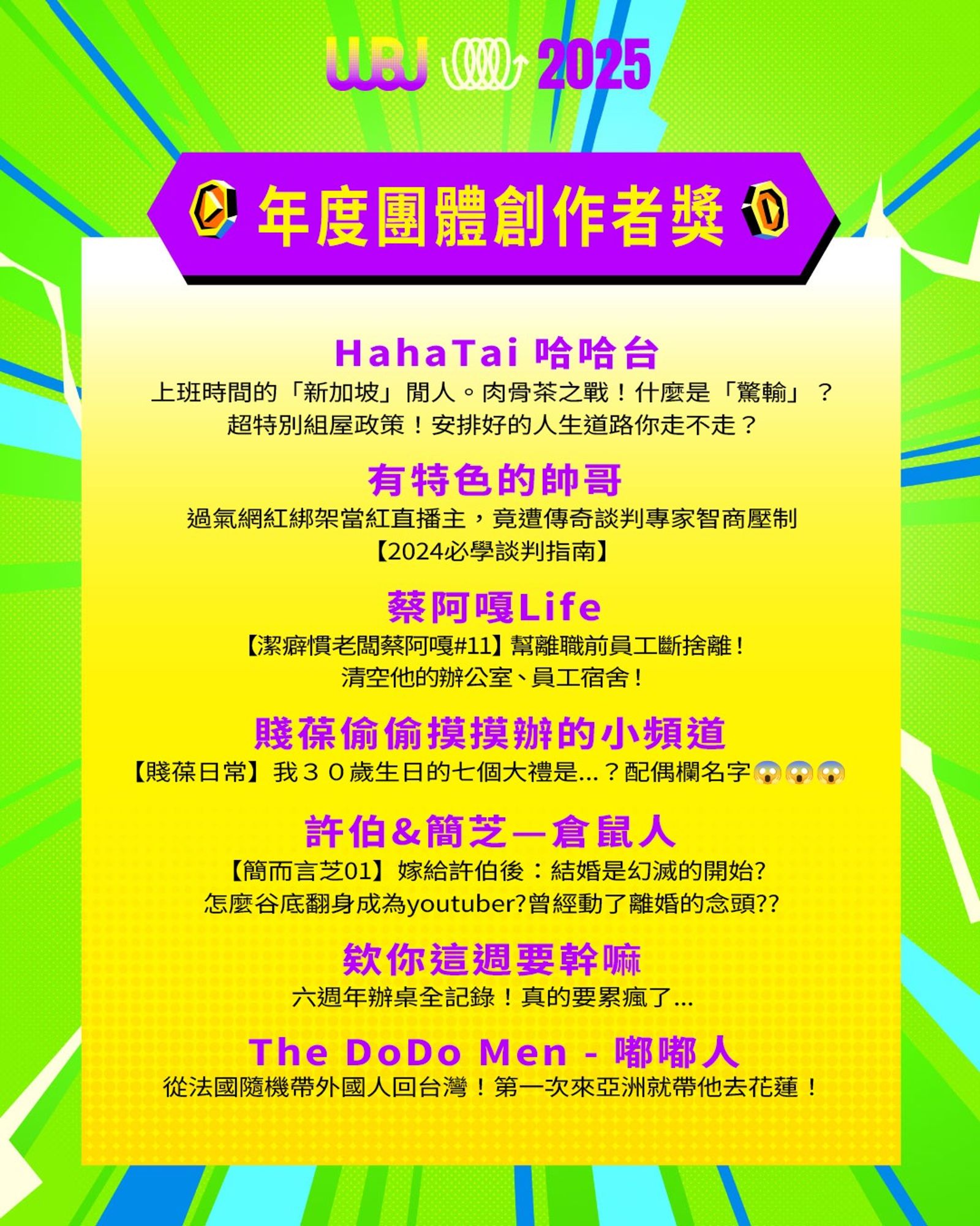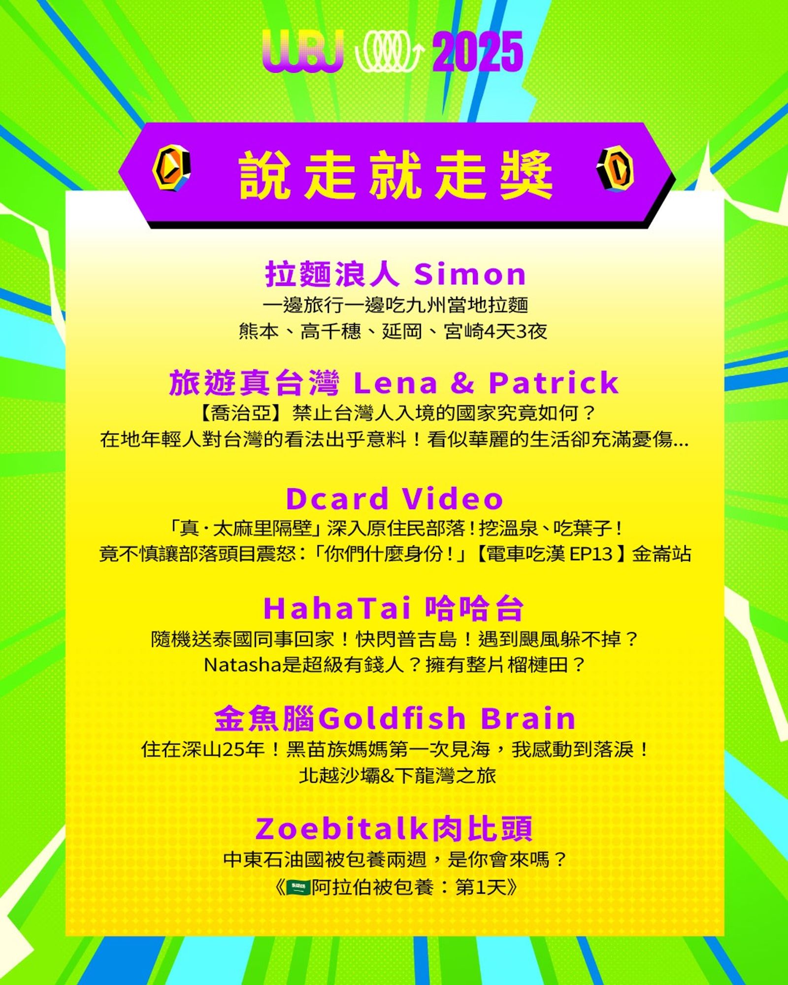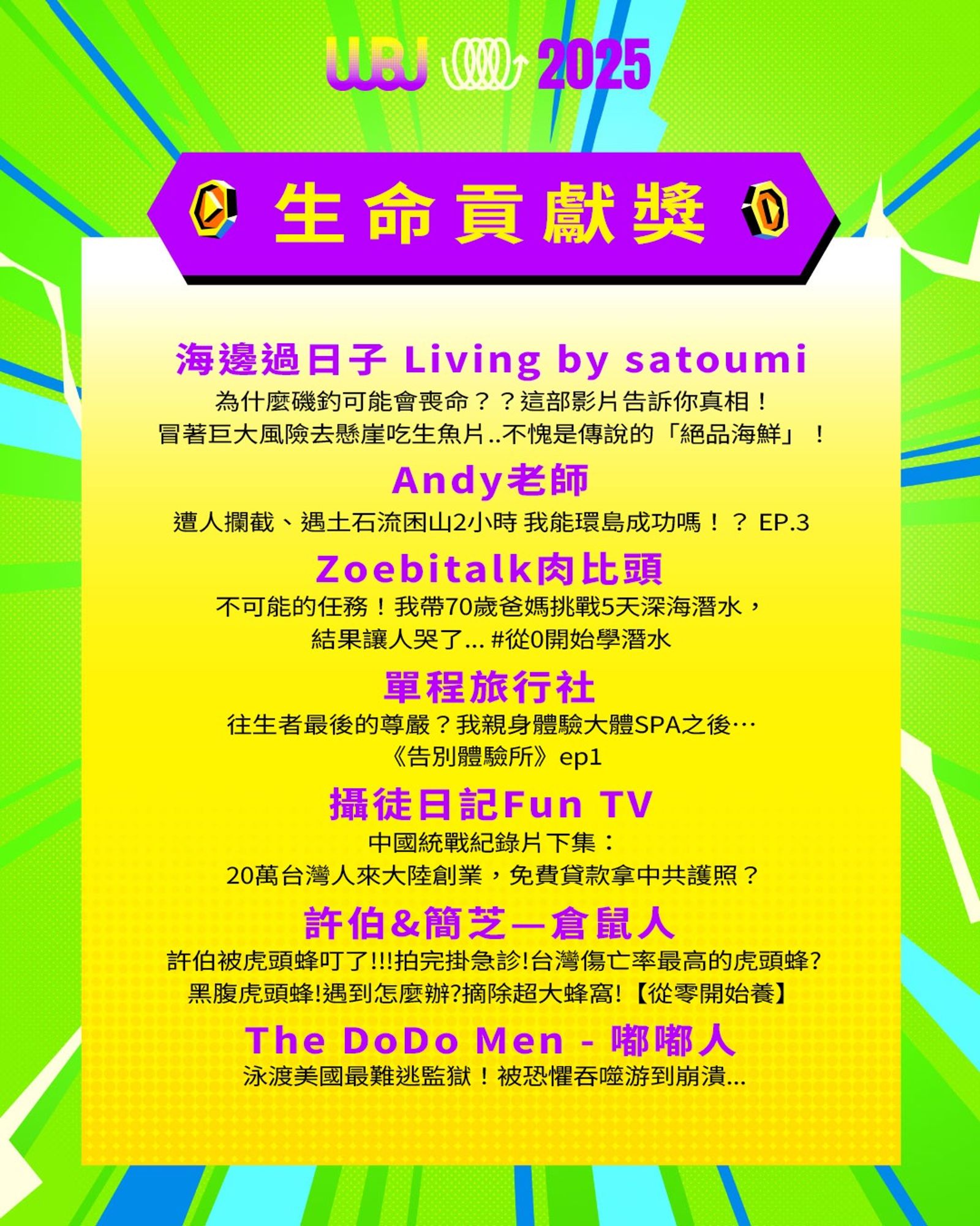 「走鐘獎」(Walk Bell John Awards,簡稱 WBJ)是台灣專為 YouTuber 及新媒體網路創作者設立的年度獎項,由知名 YouTuber 團隊「上班不要看」於 2019 年創辦。它是模仿台灣三大娛樂獎項(金馬獎、金鐘獎、金曲獎)的幽默變奏版,旨在表彰優秀的網路影音作品,分為多個類別如「一級玩家獎」、「金頭腦獎」等,強調趣味性和創意鼓勵。 目前已舉辦至第七屆,2025 年入圍名單剛於28日公布,頒獎典禮預計在 11 月 15 日舉行。