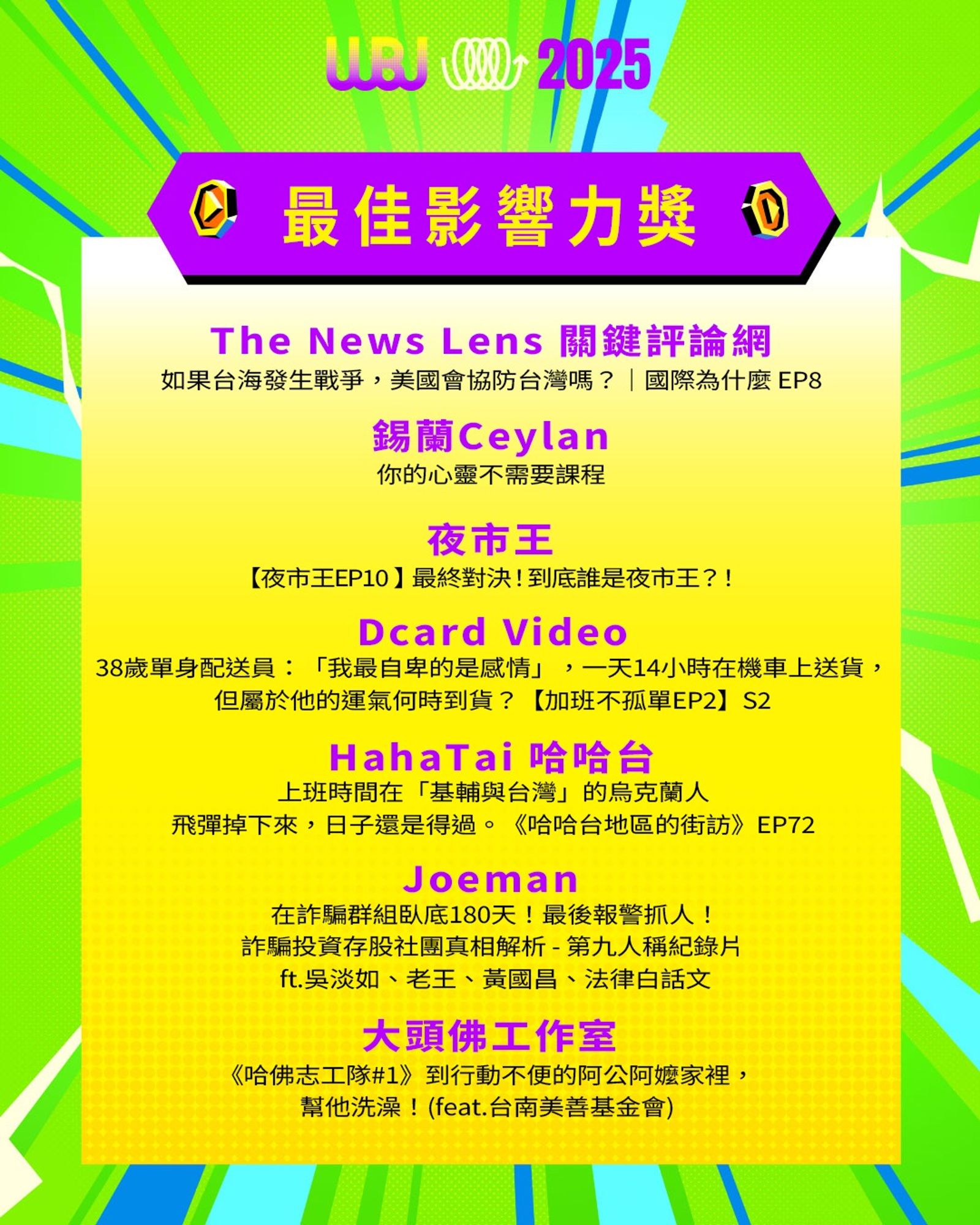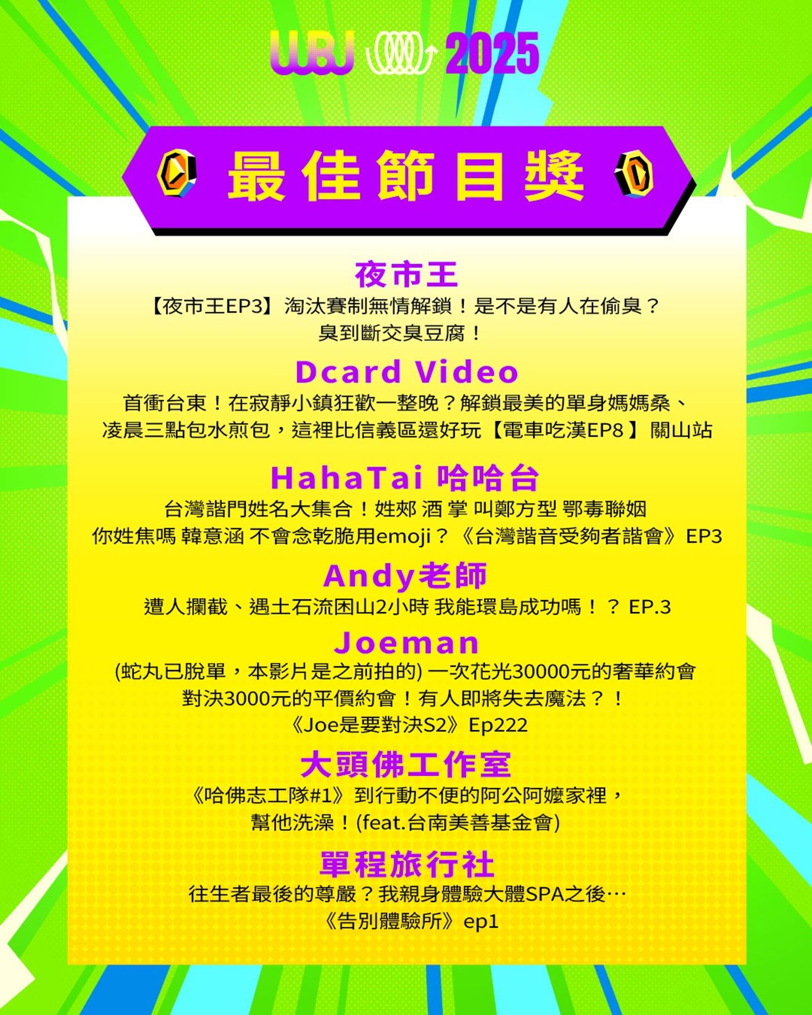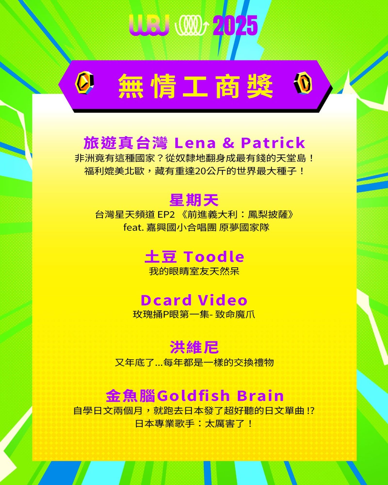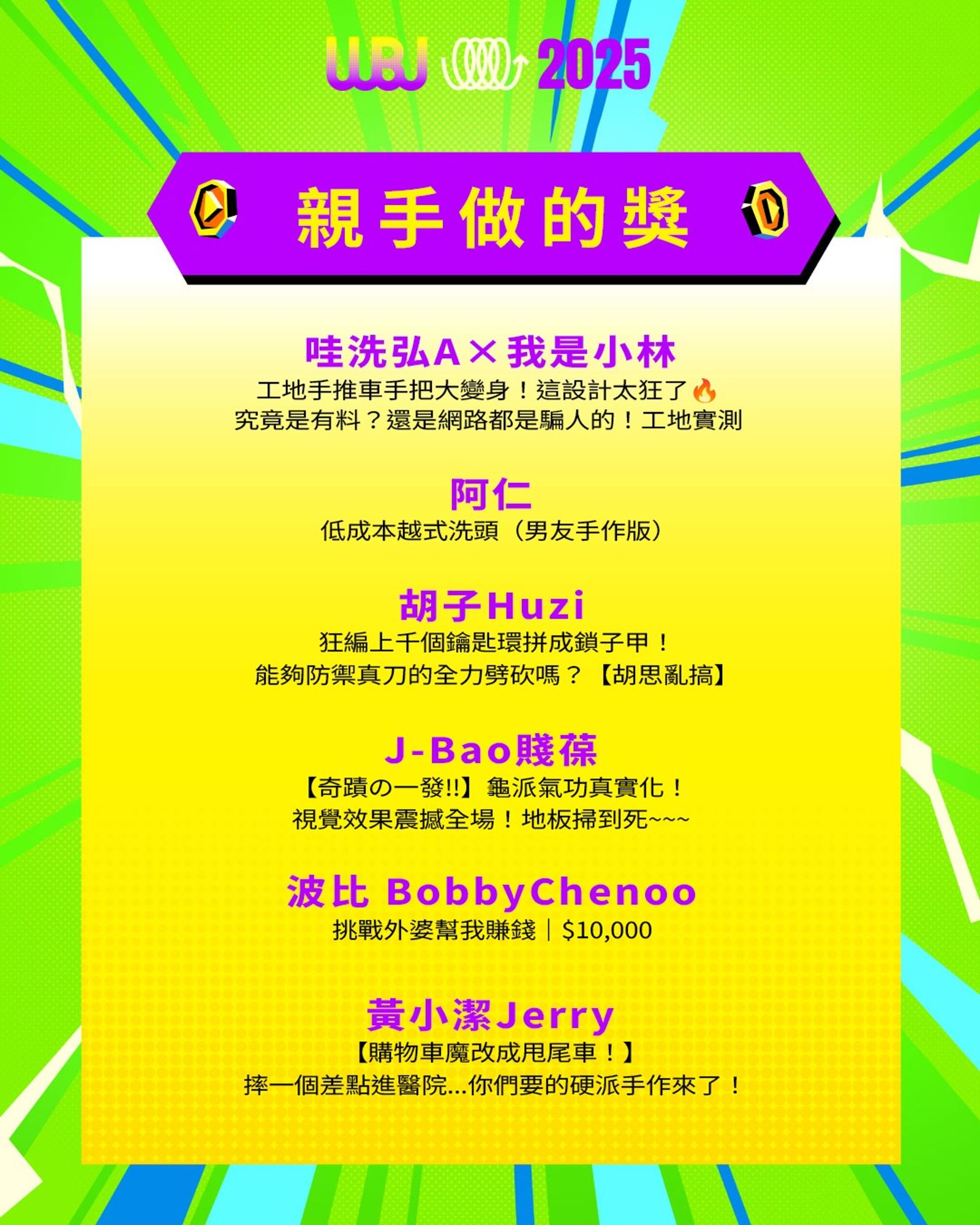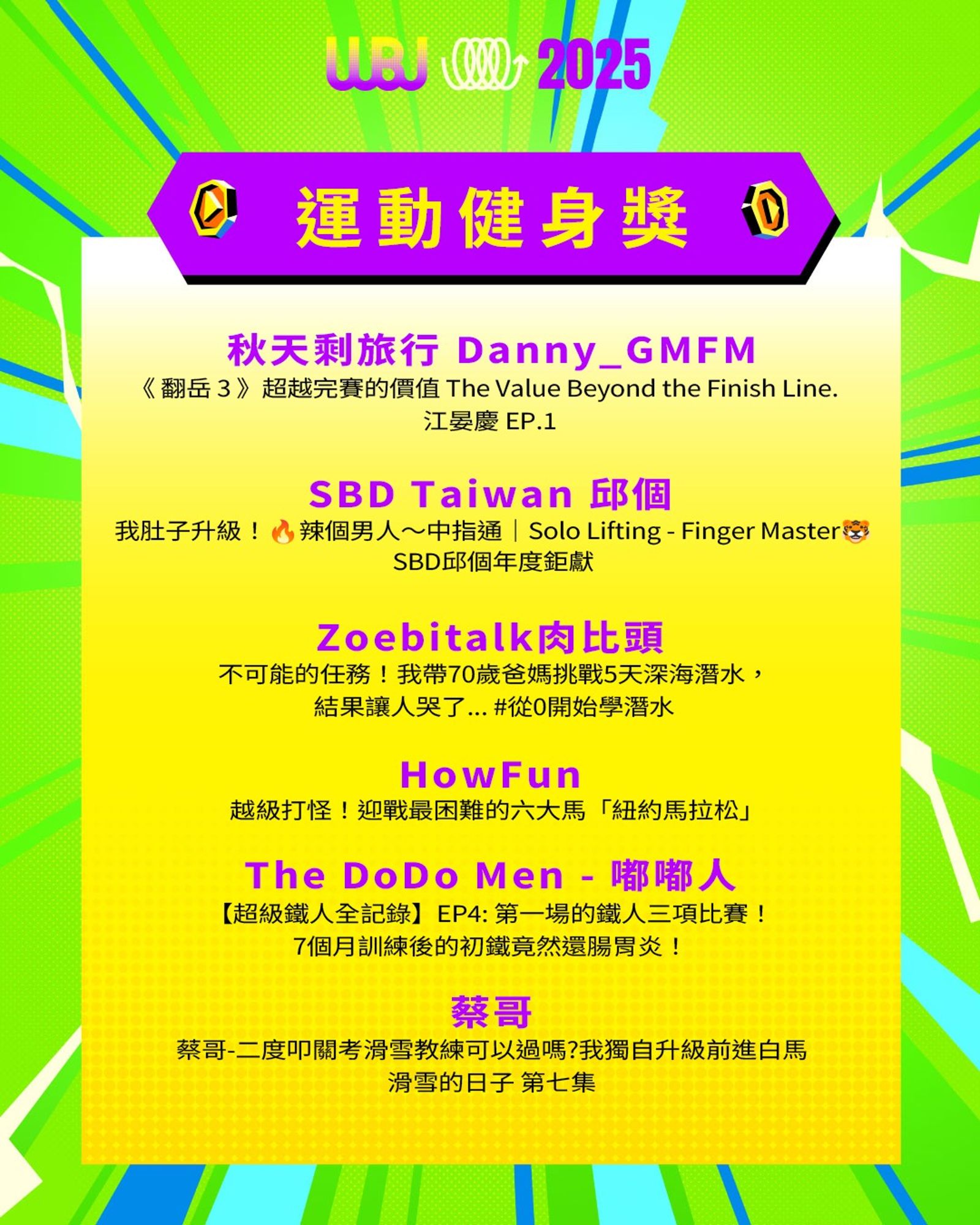 「走鐘獎」(Walk Bell John Awards,簡稱 WBJ)是台灣專為 YouTuber 及新媒體網路創作者設立的年度獎項,由知名 YouTuber 團隊「上班不要看」於 2019 年創辦。它是模仿台灣三大娛樂獎項(金馬獎、金鐘獎、金曲獎)的幽默變奏版,旨在表彰優秀的網路影音作品,分為多個類別如「一級玩家獎」、「金頭腦獎」等,強調趣味性和創意鼓勵。 目前已舉辦至第七屆,2025 年入圍名單剛於28日公布,頒獎典禮預計在 11 月 15 日舉行。