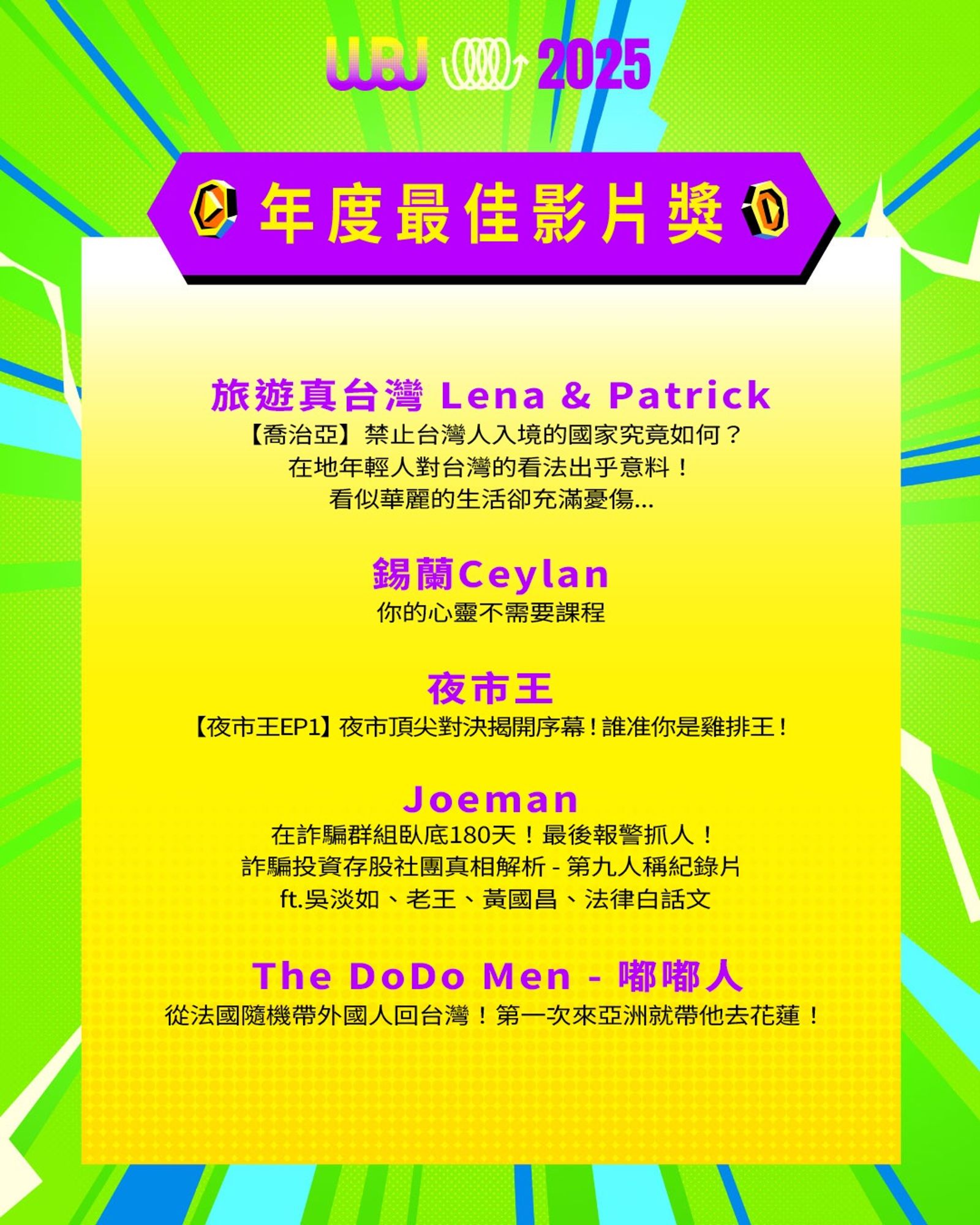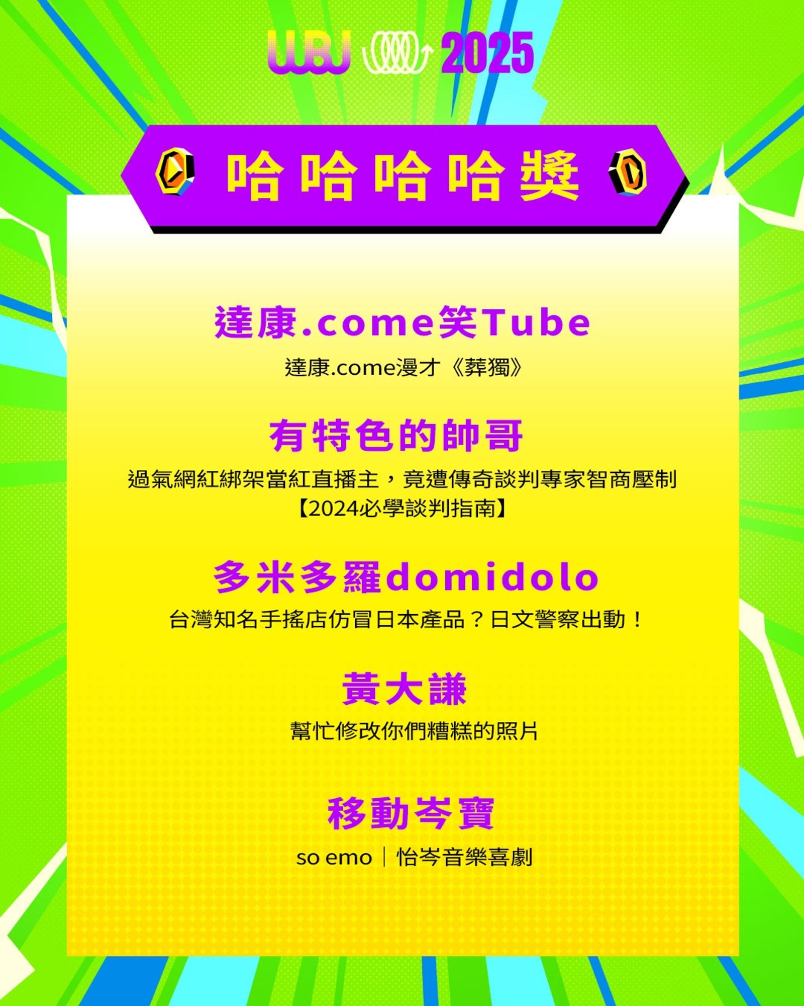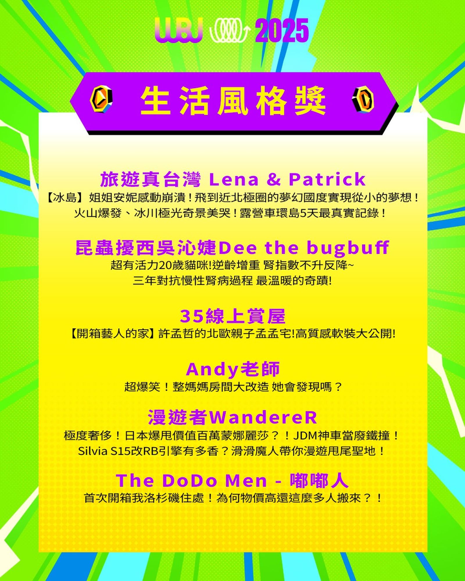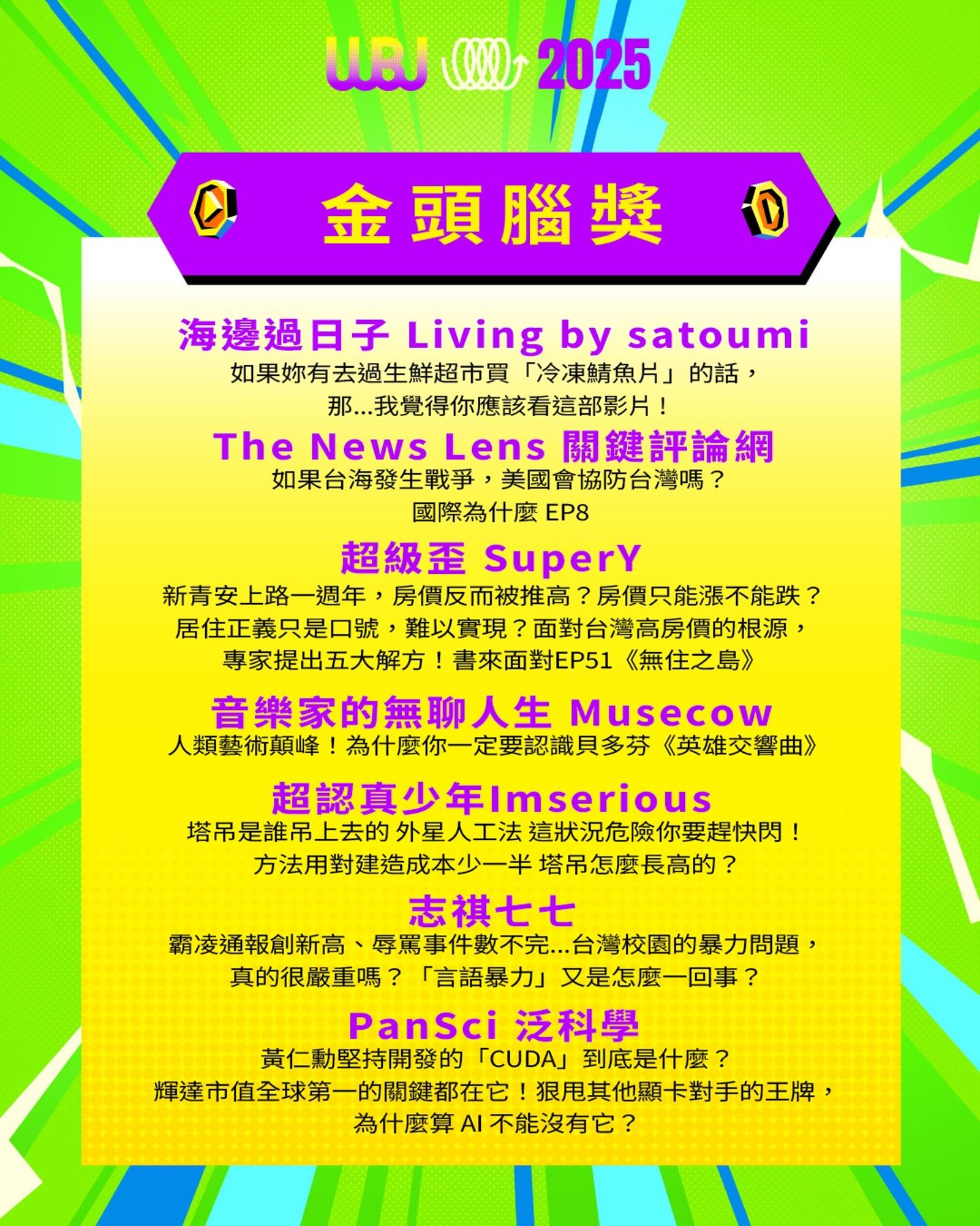 「走鐘獎」(Walk Bell John Awards,簡稱 WBJ)是台灣專為 YouTuber 及新媒體網路創作者設立的年度獎項,由知名 YouTuber 團隊「上班不要看」於 2019 年創辦。它是模仿台灣三大娛樂獎項(金馬獎、金鐘獎、金曲獎)的幽默變奏版,旨在表彰優秀的網路影音作品,分為多個類別如「一級玩家獎」、「金頭腦獎」等,強調趣味性和創意鼓勵。 目前已舉辦至第七屆,2025 年入圍名單剛於28日公布,頒獎典禮預計在 11 月 15 日舉行。