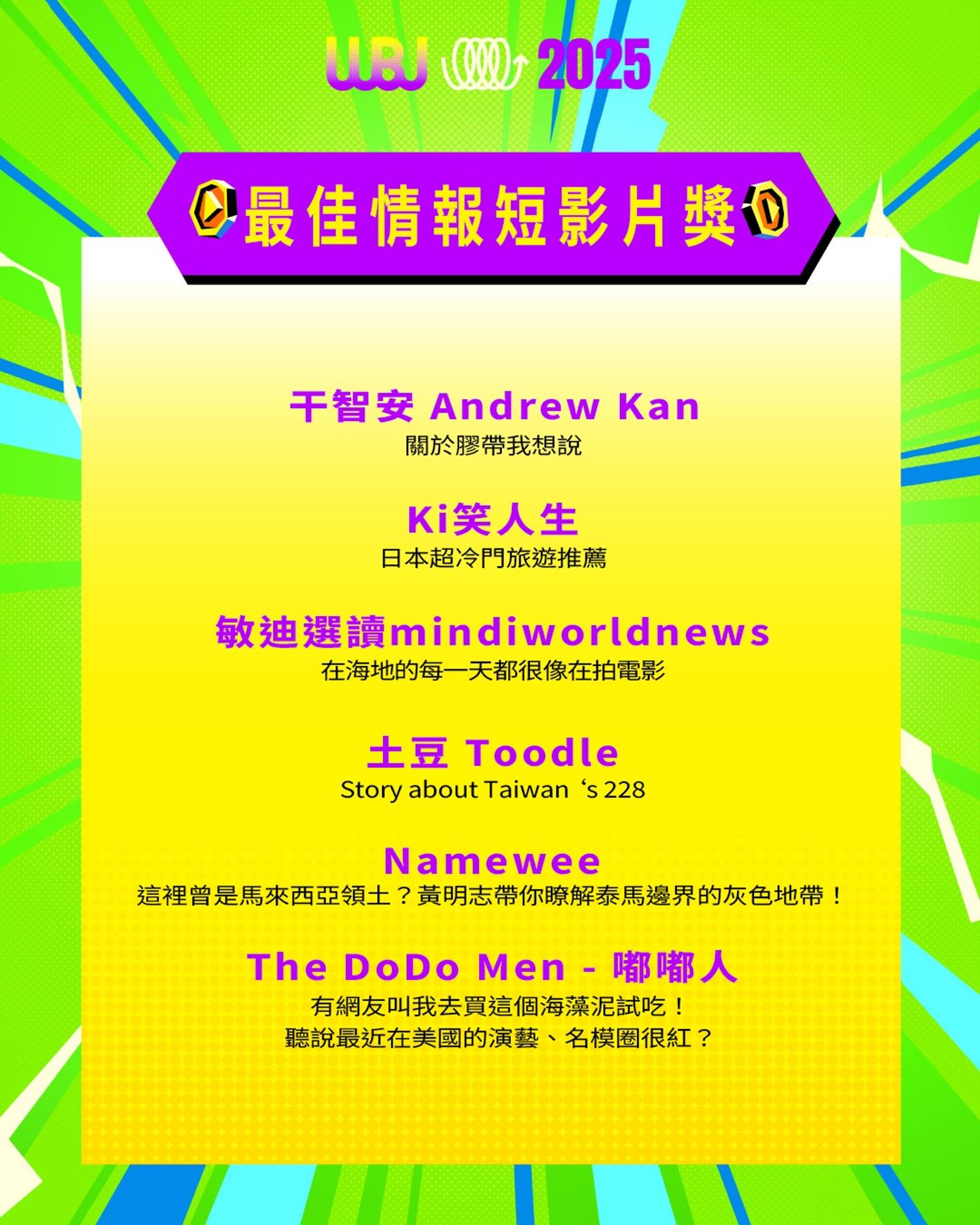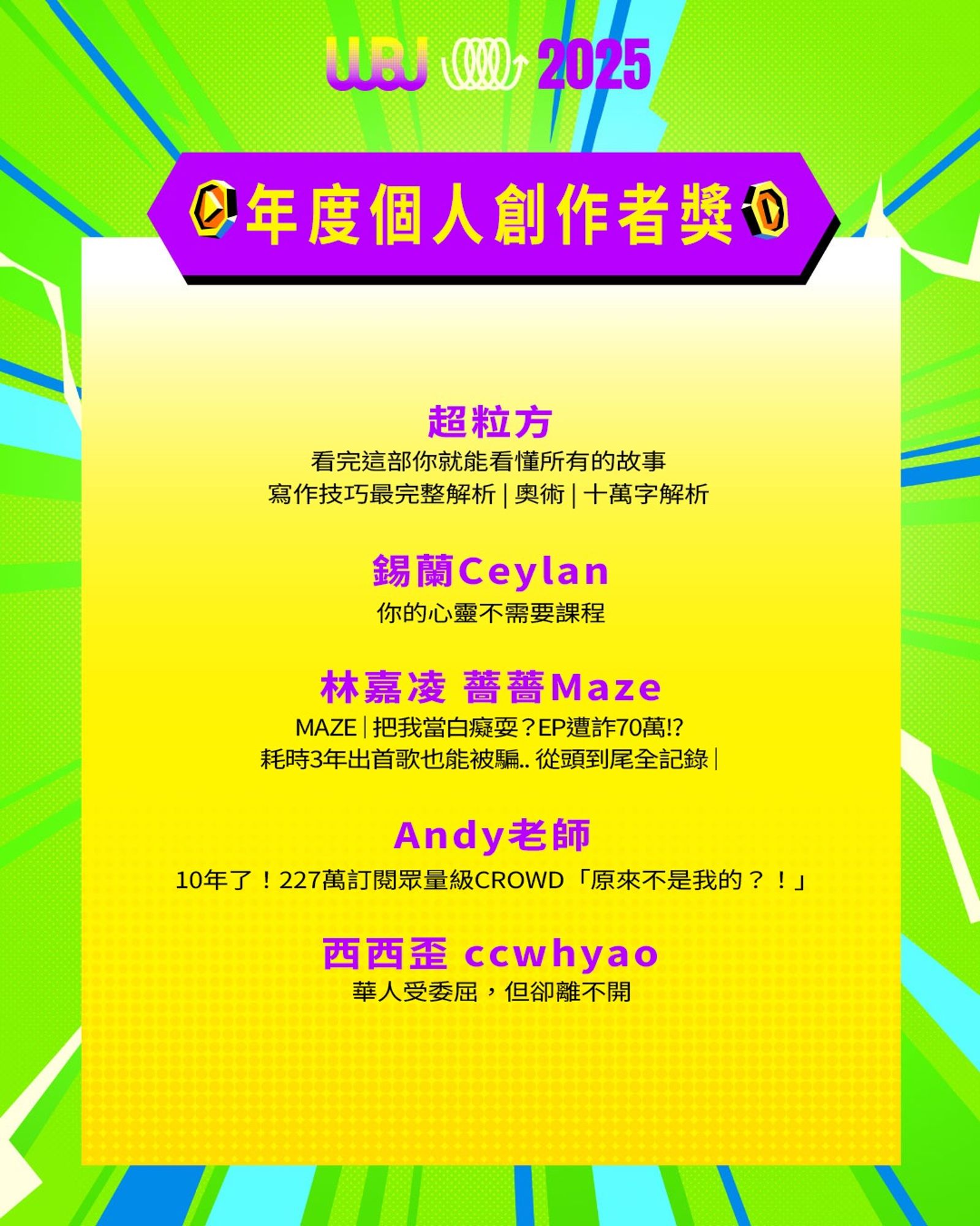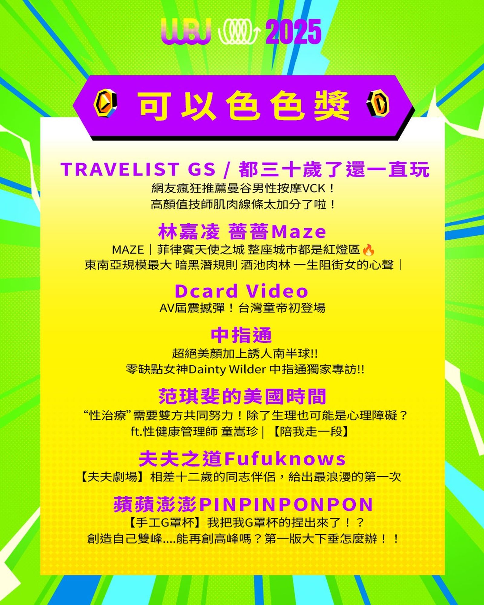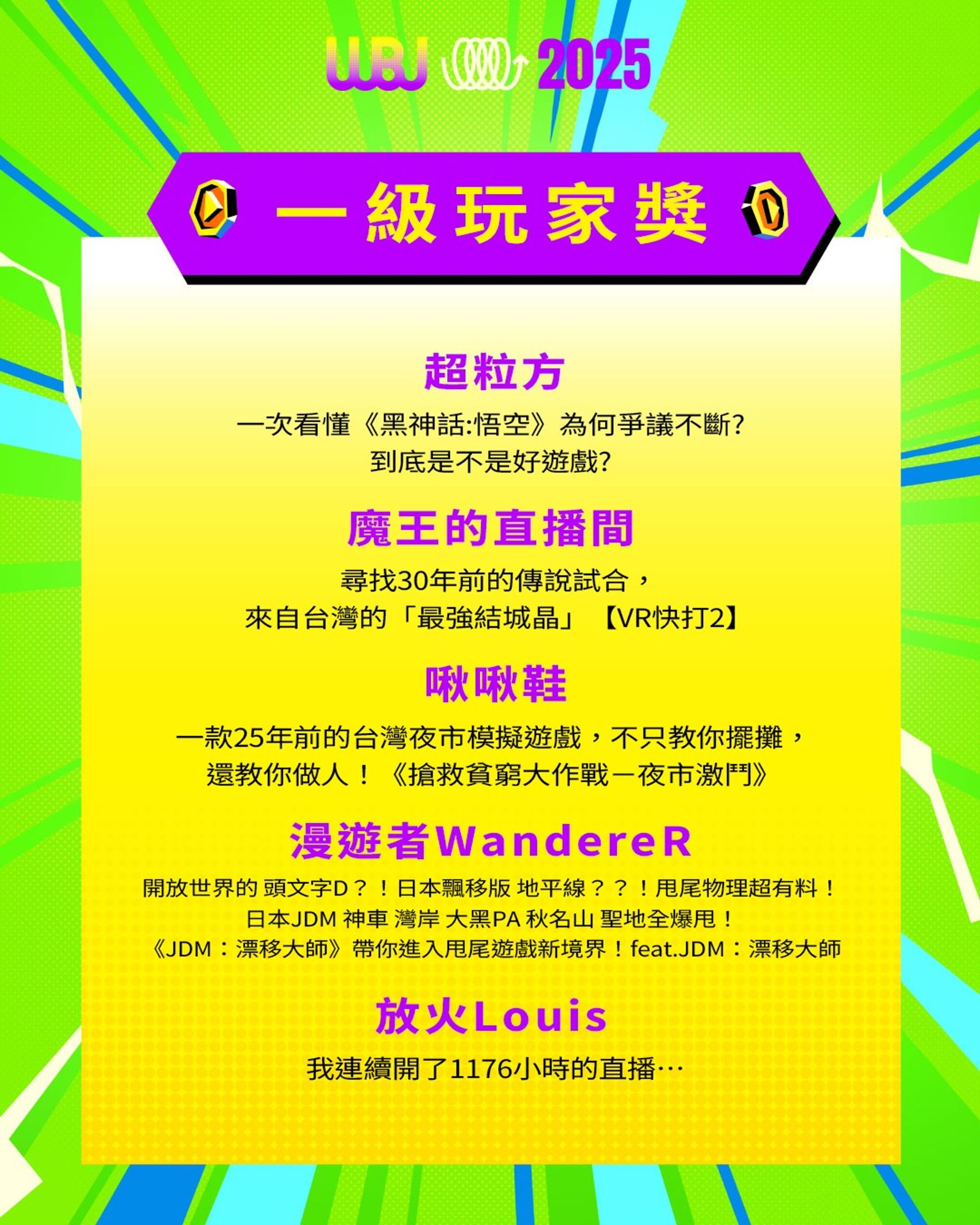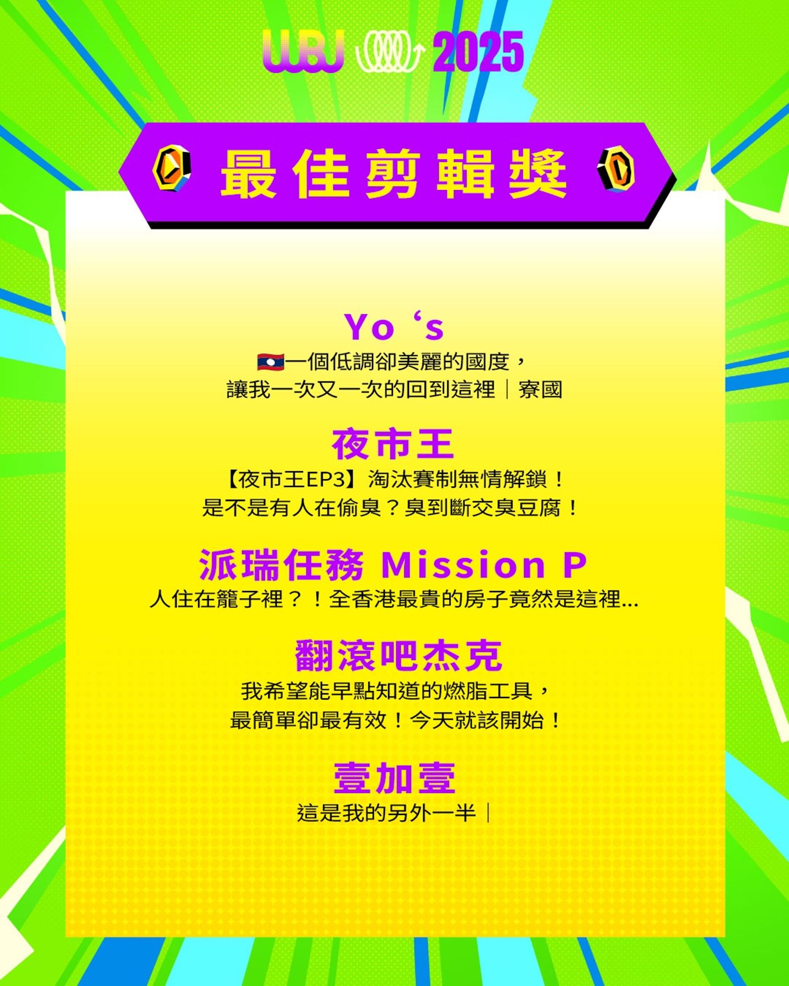 「走鐘獎」(Walk Bell John Awards,簡稱 WBJ)是台灣專為 YouTuber 及新媒體網路創作者設立的年度獎項,由知名 YouTuber 團隊「上班不要看」於 2019 年創辦。它是模仿台灣三大娛樂獎項(金馬獎、金鐘獎、金曲獎)的幽默變奏版,旨在表彰優秀的網路影音作品,分為多個類別如「一級玩家獎」、「金頭腦獎」等,強調趣味性和創意鼓勵。 目前已舉辦至第七屆,2025 年入圍名單剛於28日公布,頒獎典禮預計在 11 月 15 日舉行。
