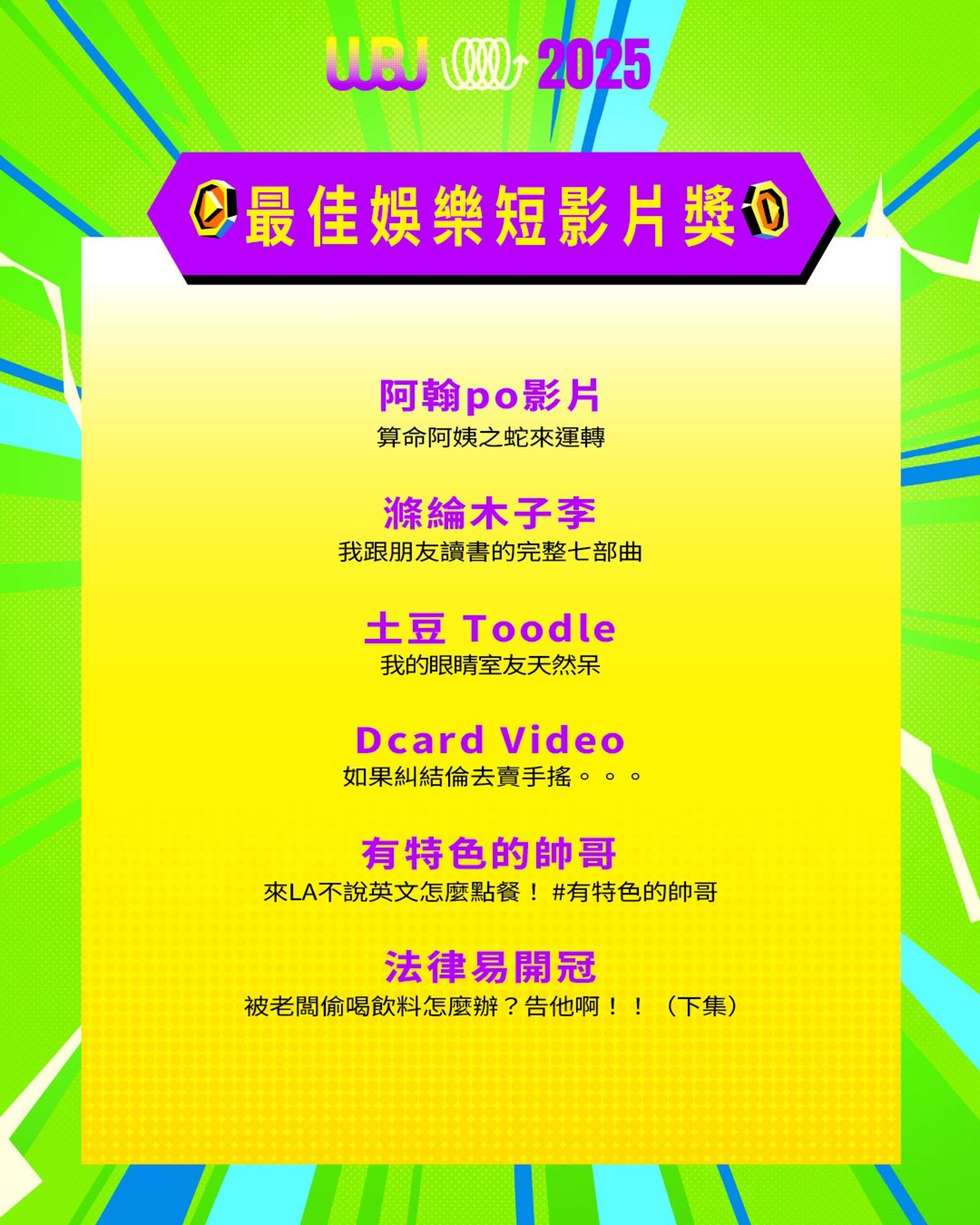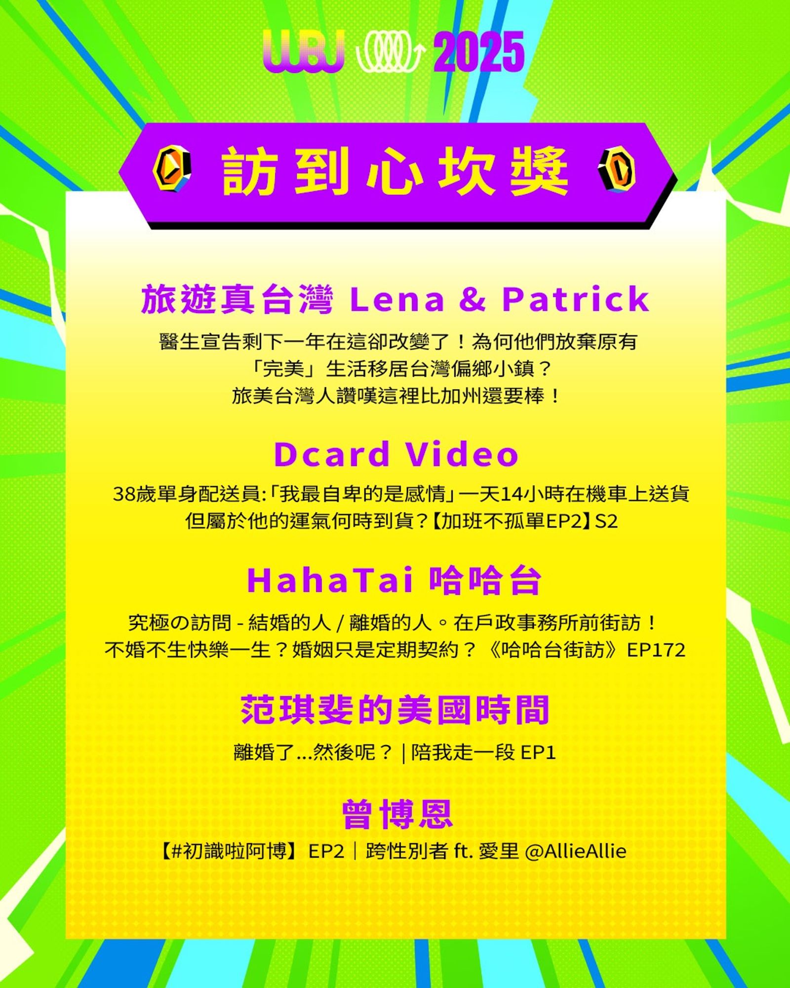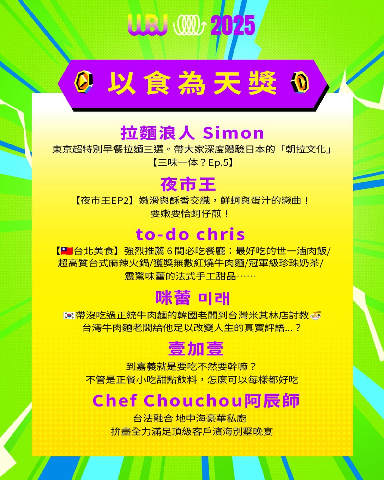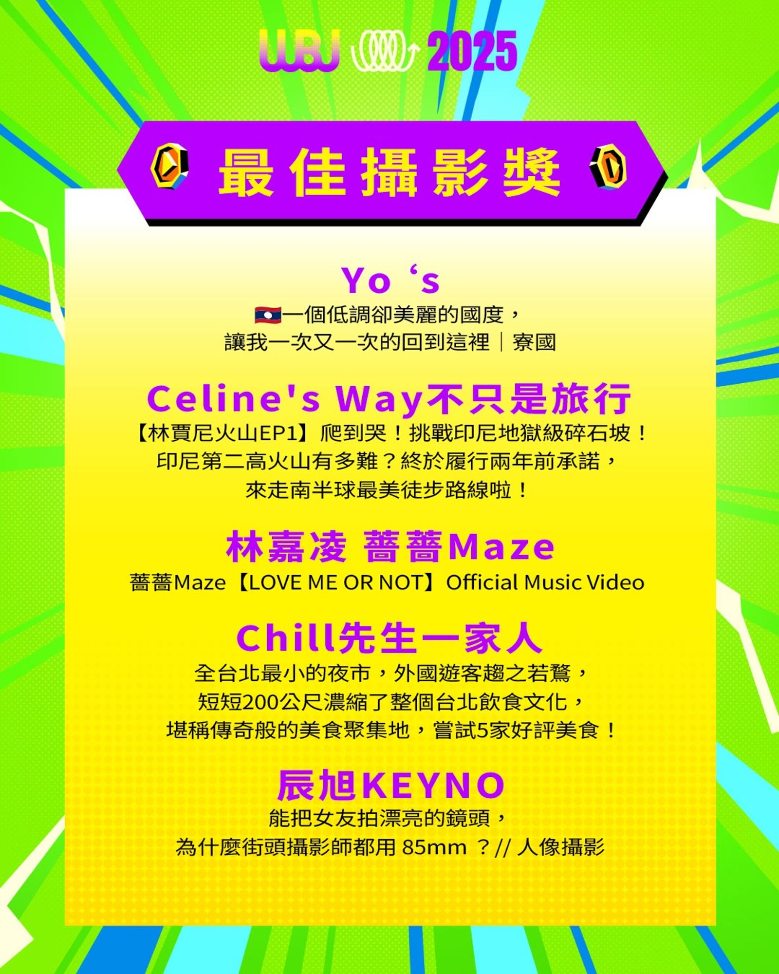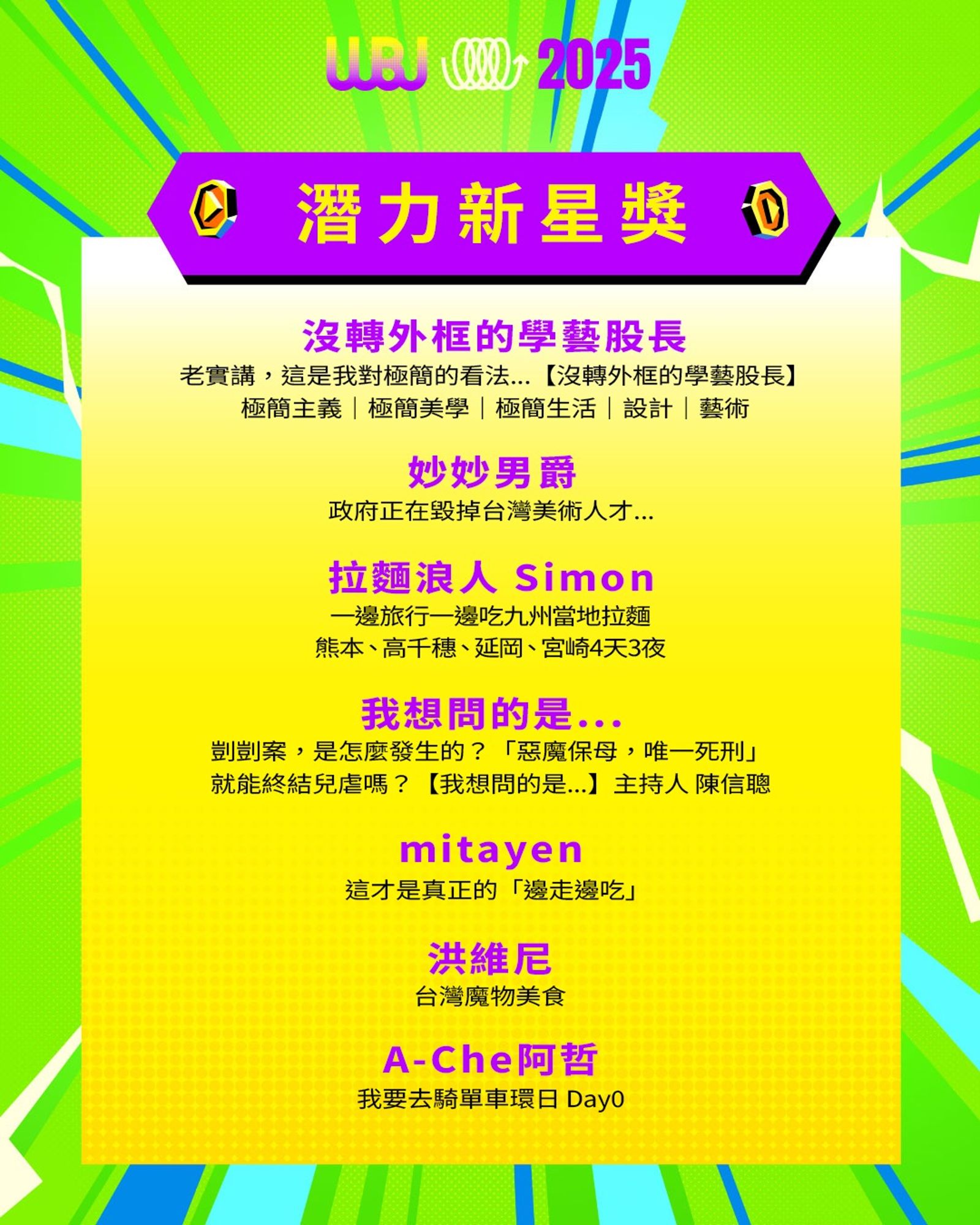 「走鐘獎」(Walk Bell John Awards,簡稱 WBJ)是台灣專為 YouTuber 及新媒體網路創作者設立的年度獎項,由知名 YouTuber 團隊「上班不要看」於 2019 年創辦。它是模仿台灣三大娛樂獎項(金馬獎、金鐘獎、金曲獎)的幽默變奏版,旨在表彰優秀的網路影音作品,分為多個類別如「一級玩家獎」、「金頭腦獎」等,強調趣味性和創意鼓勵。 目前已舉辦至第七屆,2025 年入圍名單剛於28日公布,頒獎典禮預計在 11 月 15 日舉行。
