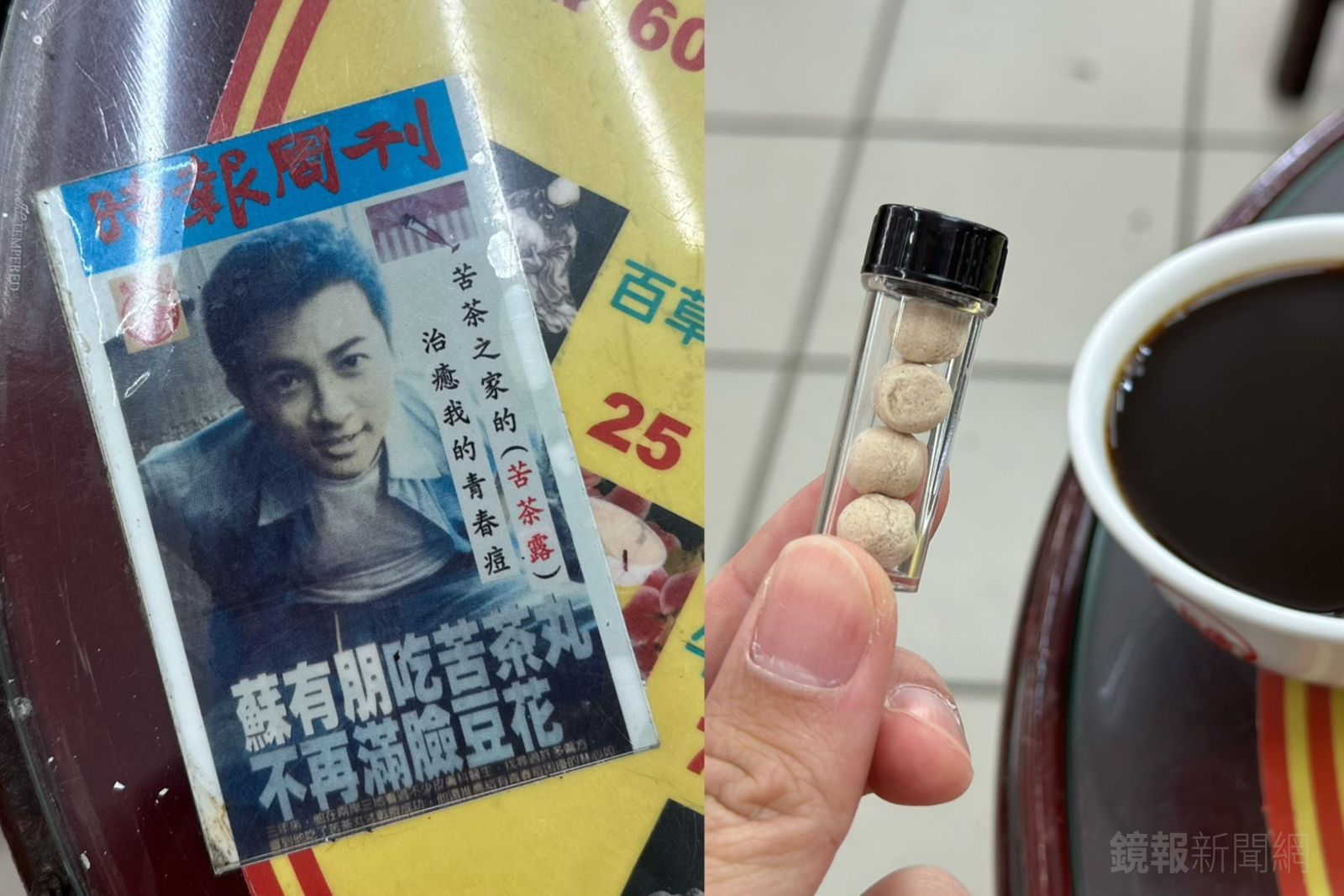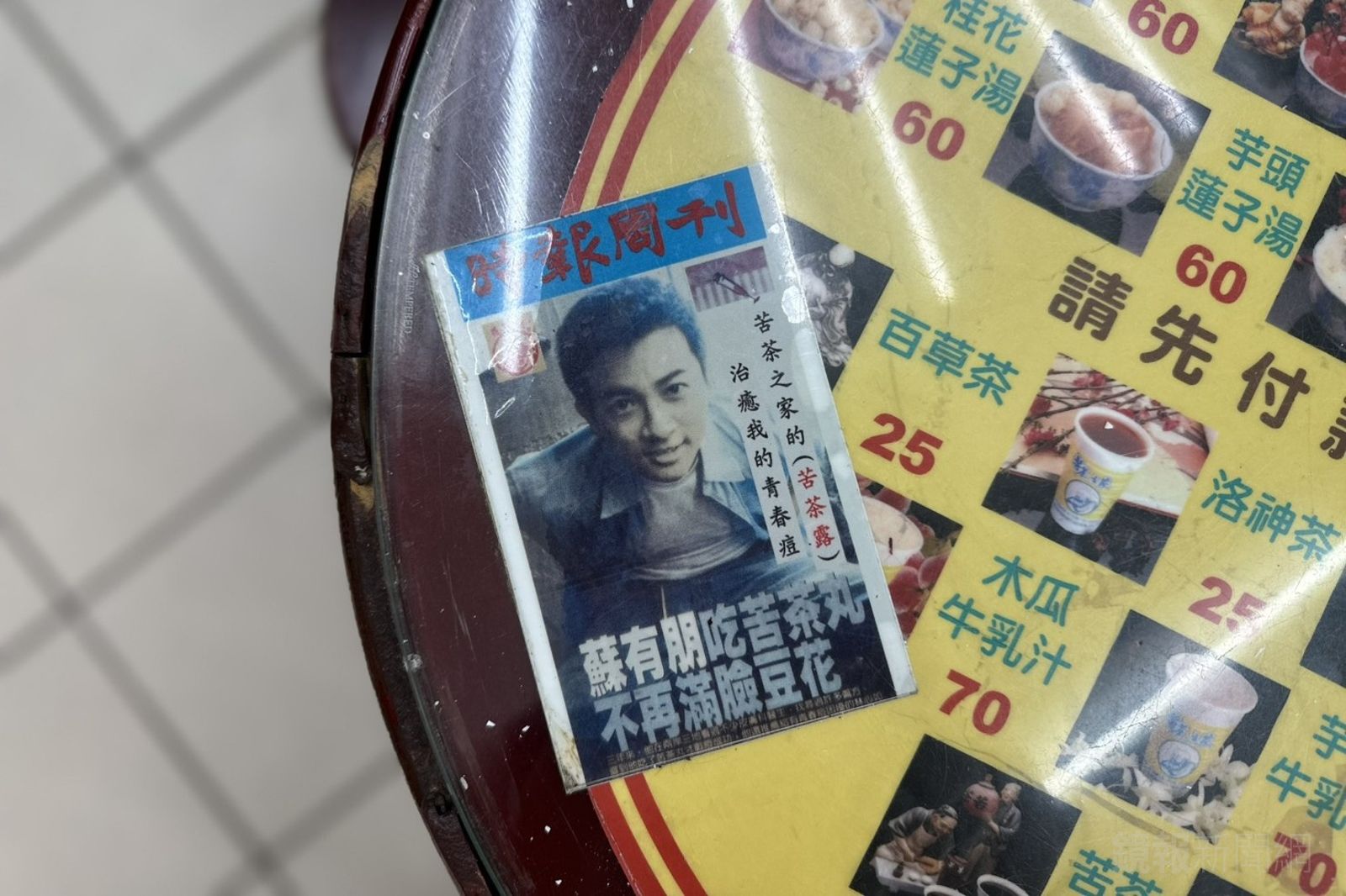走進店家,坐下來點餐,就能看到桌上除了菜單,還放著蘇有朋的週刊封面照,標題寫著「蘇有朋吃苦茶丸不再滿臉豆花」,讓最近嘴角生瘡的我,也決定點一碗苦茶降火氣,救回一點顏值。