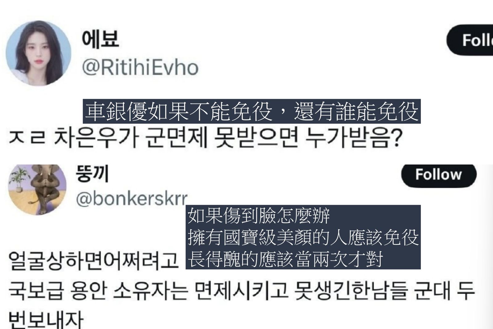 韓國「臉蛋天才」車銀優傳出7月即將當兵的消息,讓粉絲哀號遍野,崩潰留言表示,「擁有金牌級顏值的人怎麼能當兵,逆天美顏受傷了怎麼辦?」、「應該是國家要保衛車銀優,不是車銀優保衛國家吧」、「演藝圈要進入顏值黑暗期了!」即便車銀優的入伍消息尚未敲定,已讓粉絲紛紛喊話要求南韓政府修法,「臉蛋天才應該免當兵!」