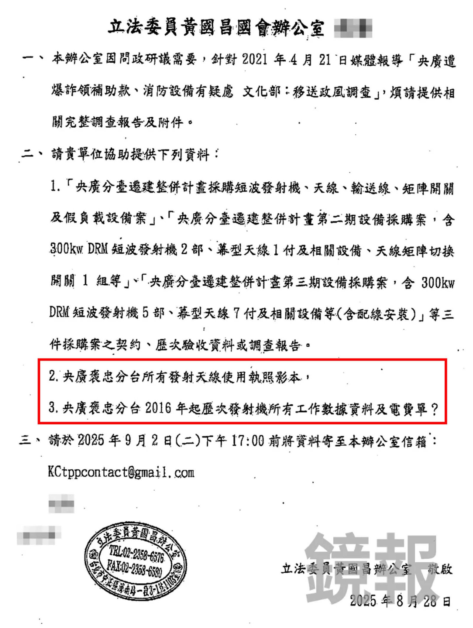 昨天(17日)《鏡報》獨家報導,黃國昌辦公室要求中央廣播電台提供褒忠分台十年來的歷次發射機,所有工作數據資料及電費單等機敏資料,引發各界議論。消息曝光後,國安單位也立刻針對黃國昌到底要了哪些機敏資料,進行了解分析。