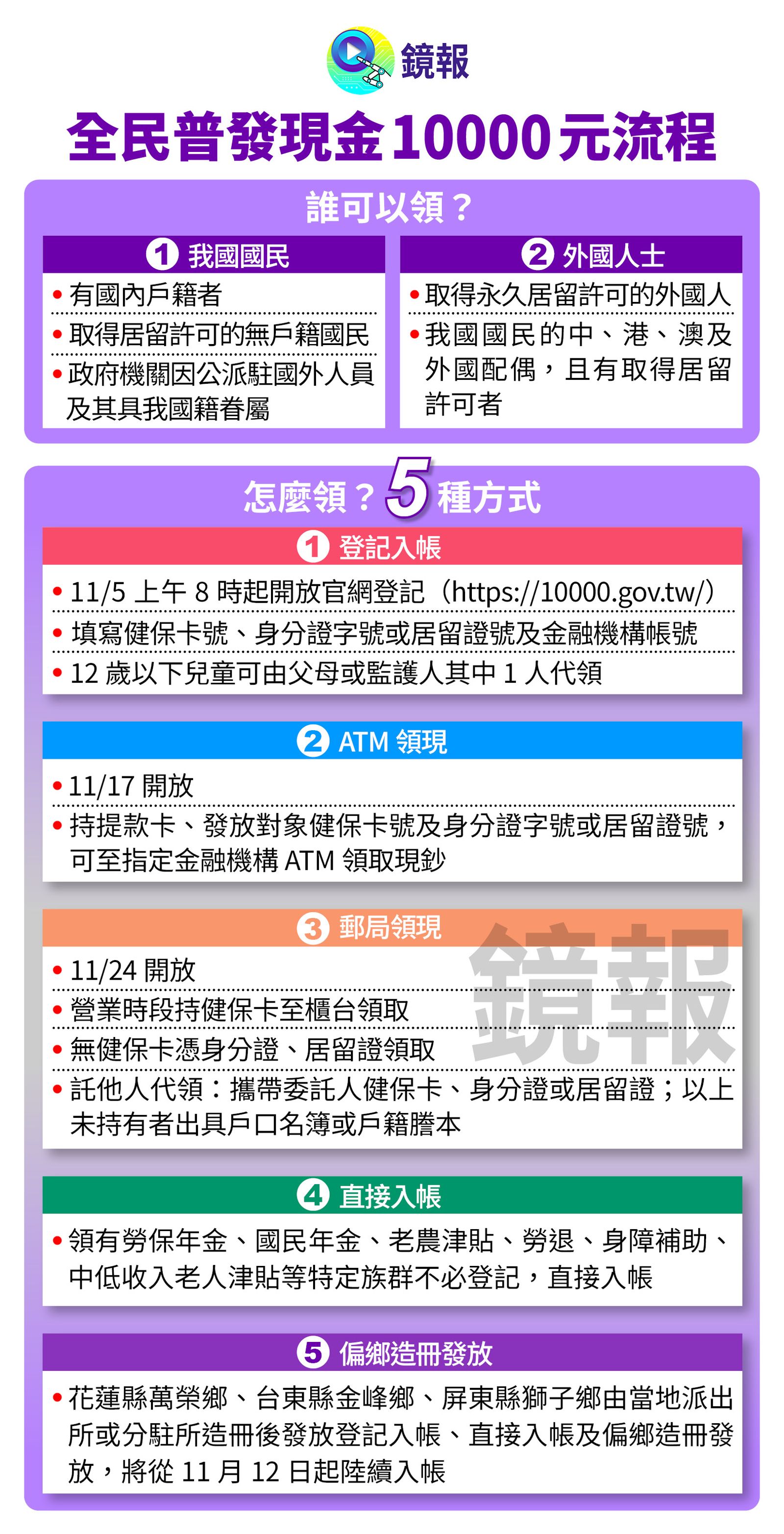 各界矚目的普發現金1萬元方案正式拍板!立法院17日三讀通過韌性特別預算案後,總統府於23日晚間正式公告。行政院隨即召開記者會,公布完整的領取資格、方式與時程。究竟誰能領?錢何時能入帳?《鏡報》一張圖帶你看懂。