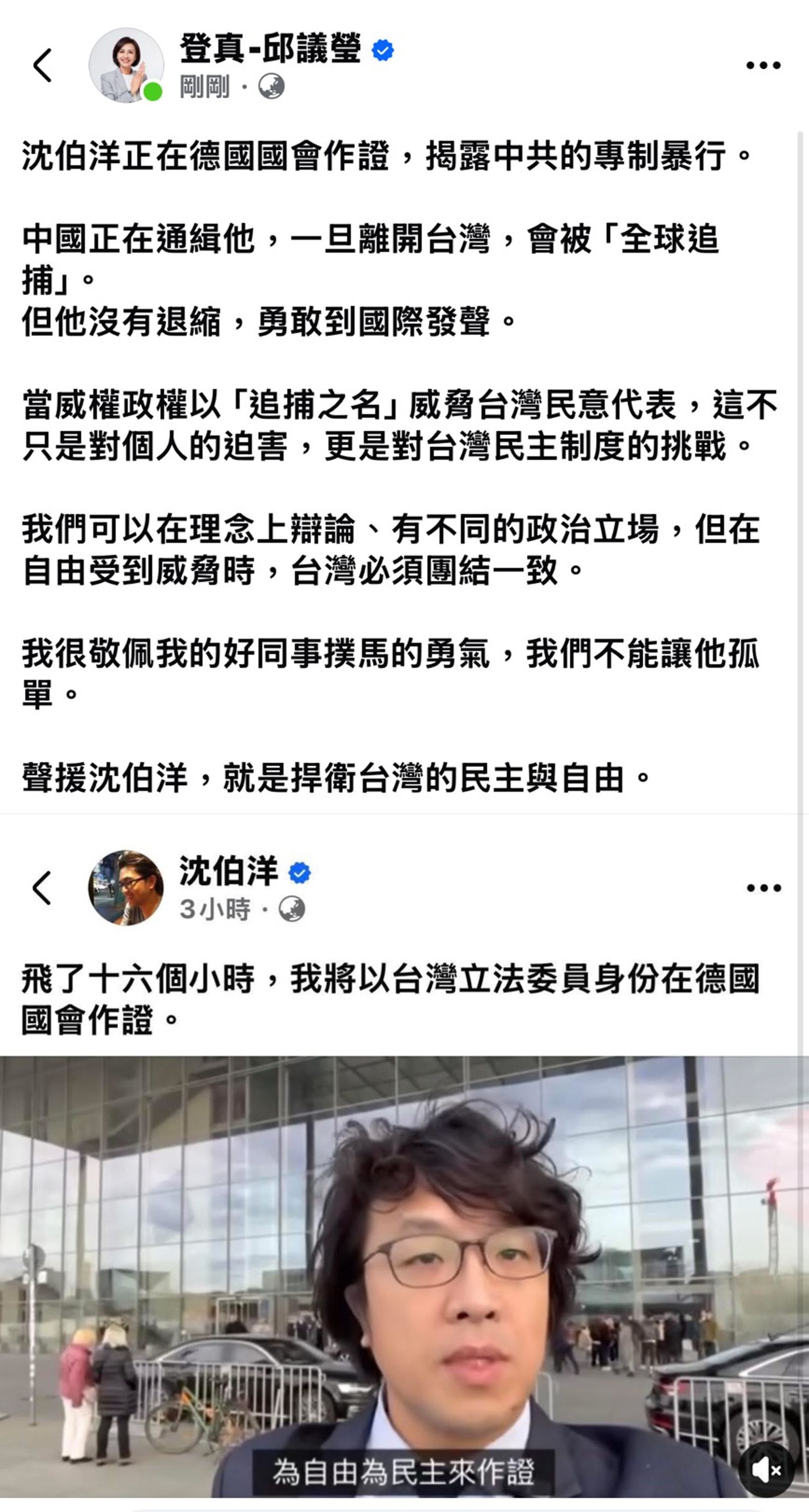 民進黨立法委員邱議瑩今天(13)日於社群發文,聲援民進黨立委沈伯洋於德國國會作證,揭露中共的專制暴行。邱議瑩指出,中國對沈伯洋發布通緝,稱一旦離開台灣,將會被「全球追捕」,但沈伯洋並沒有退縮。她呼籲共同聲援沈伯洋,捍衛台灣民主與自由。