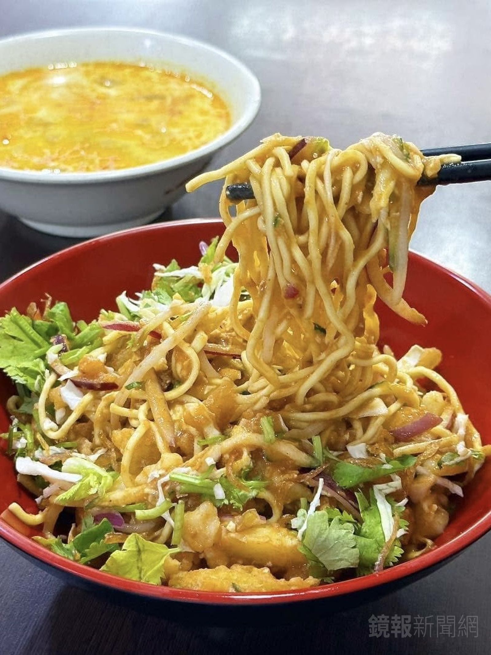 她的「緬甸涼拌麵」(90元/份)跟台式涼麵完全不同!不是加醋,是用羅望子果肉熬成醬汁,酸味自然不嗆,還帶點果香。配料超豐富,有馬鈴薯塊、油豆腐、小黃瓜、豆芽、香菜,加上魚露和蝦米粉提鮮,最後撒上炸紅洋蔥,一拌開就香到不行。麵條吸飽醬汁,酸香開胃,口感有軟有酥。