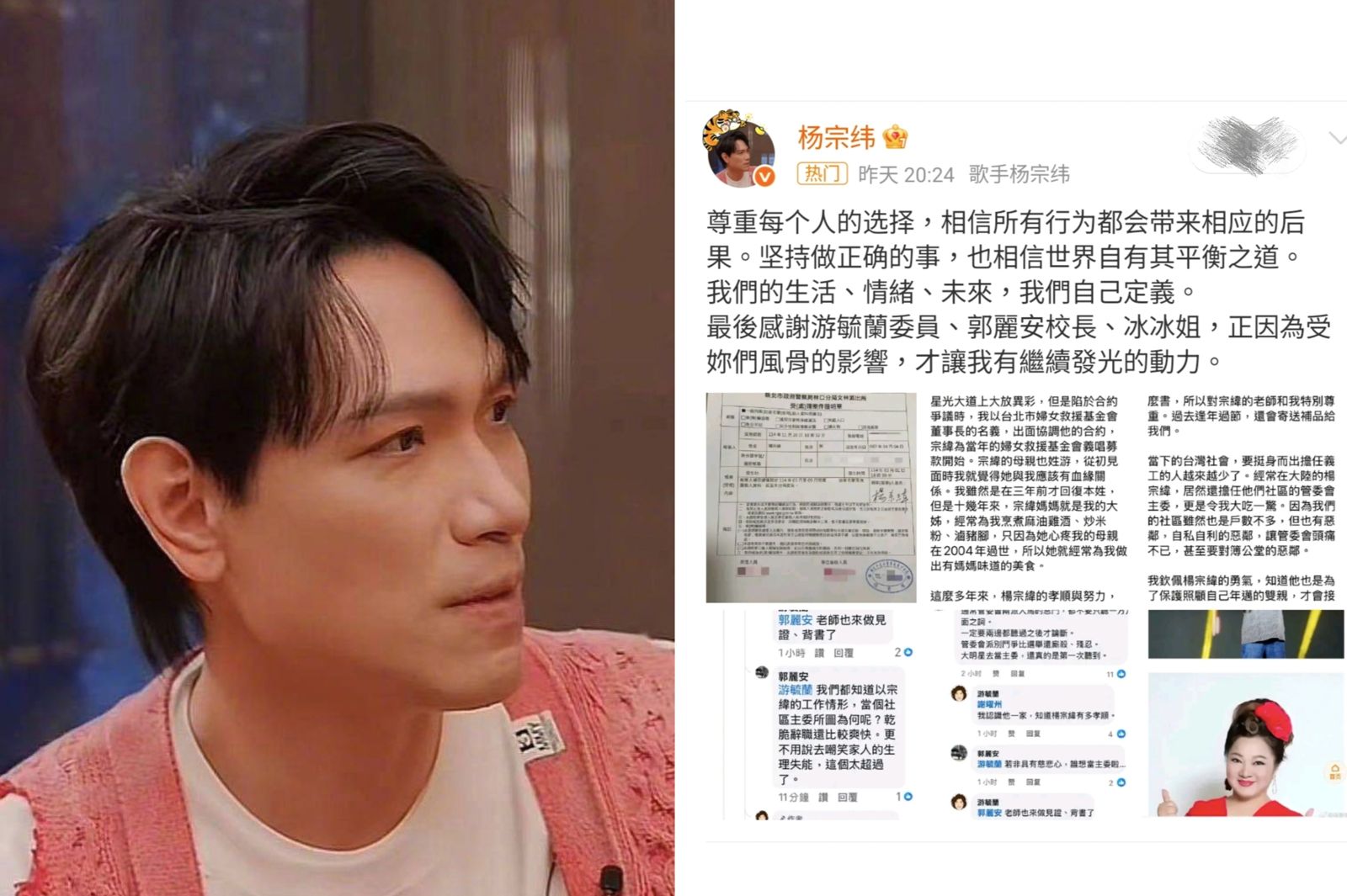 楊宗緯今年8月在中國演出時不慎從舞台摔落返台休養,近日卻捲入社區糾紛,遭住戶爆料,指控他占用公共空間、破壞公物、家人有不當行為等。對此,楊宗緯日前在微博回應澄清,昨(20日)更公開報案證明單,表示將對不實指控提告、捍衛名譽。