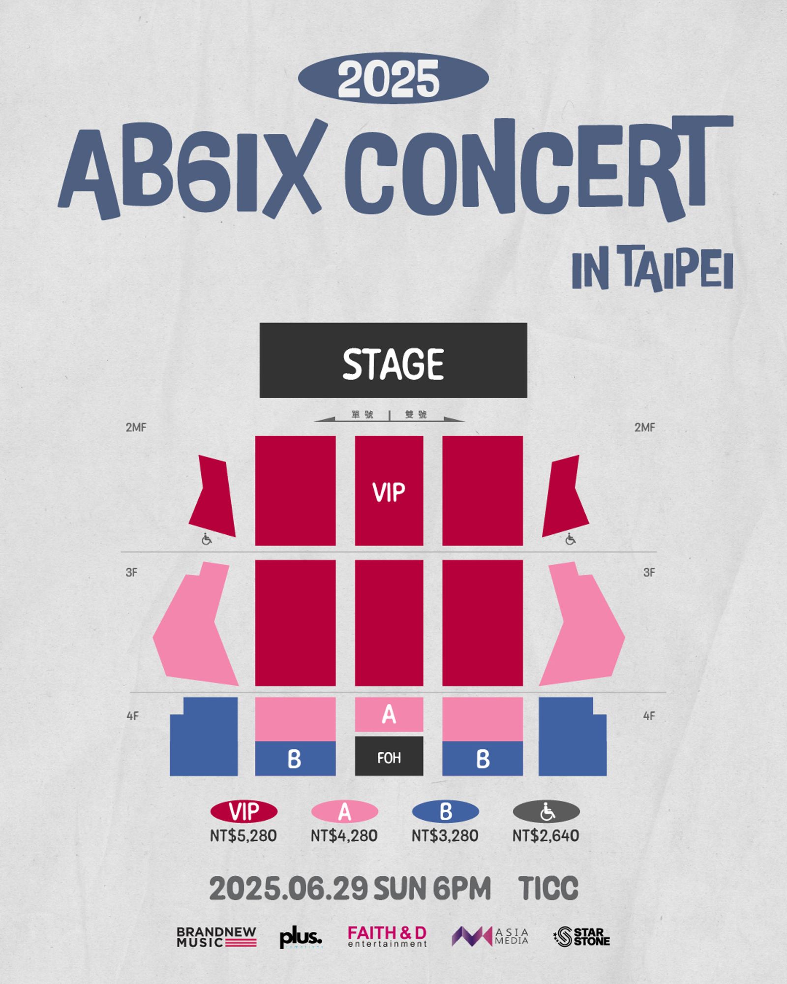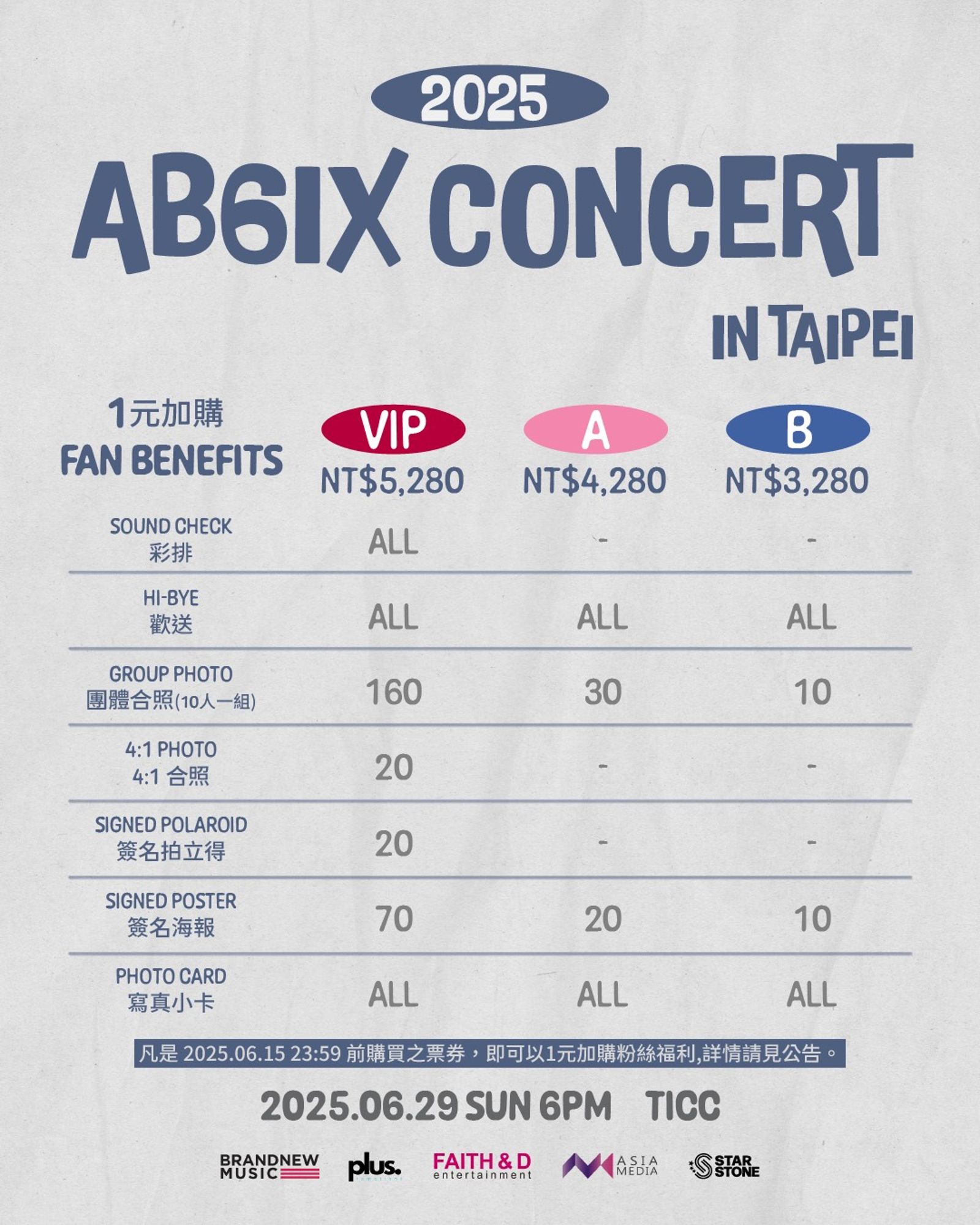 「2025 AB6IX CONCERT in Taipei」票價共分VIP 區新台幣5280元、A區4280元、B區3280元與身心區2640元,只要在6/15(日)23:59前完成購票程序,即可享全場皆可參加HI-BYE歡送與獲得典藏寫真小卡,VIP區全部可觀賞彩排與抽20名簽名拍立得外,全場還有抽10人一組團體合照共計200名以及簽名海報共100張,最珍貴的,則是還會從VIP區抽出幸運的20位粉絲直接與AB6IX四位成員進行1:4合照,門票將於5/25(日)10:00於KKTIX啟售,活動詳洽亞士傳媒 AsiaMedia。