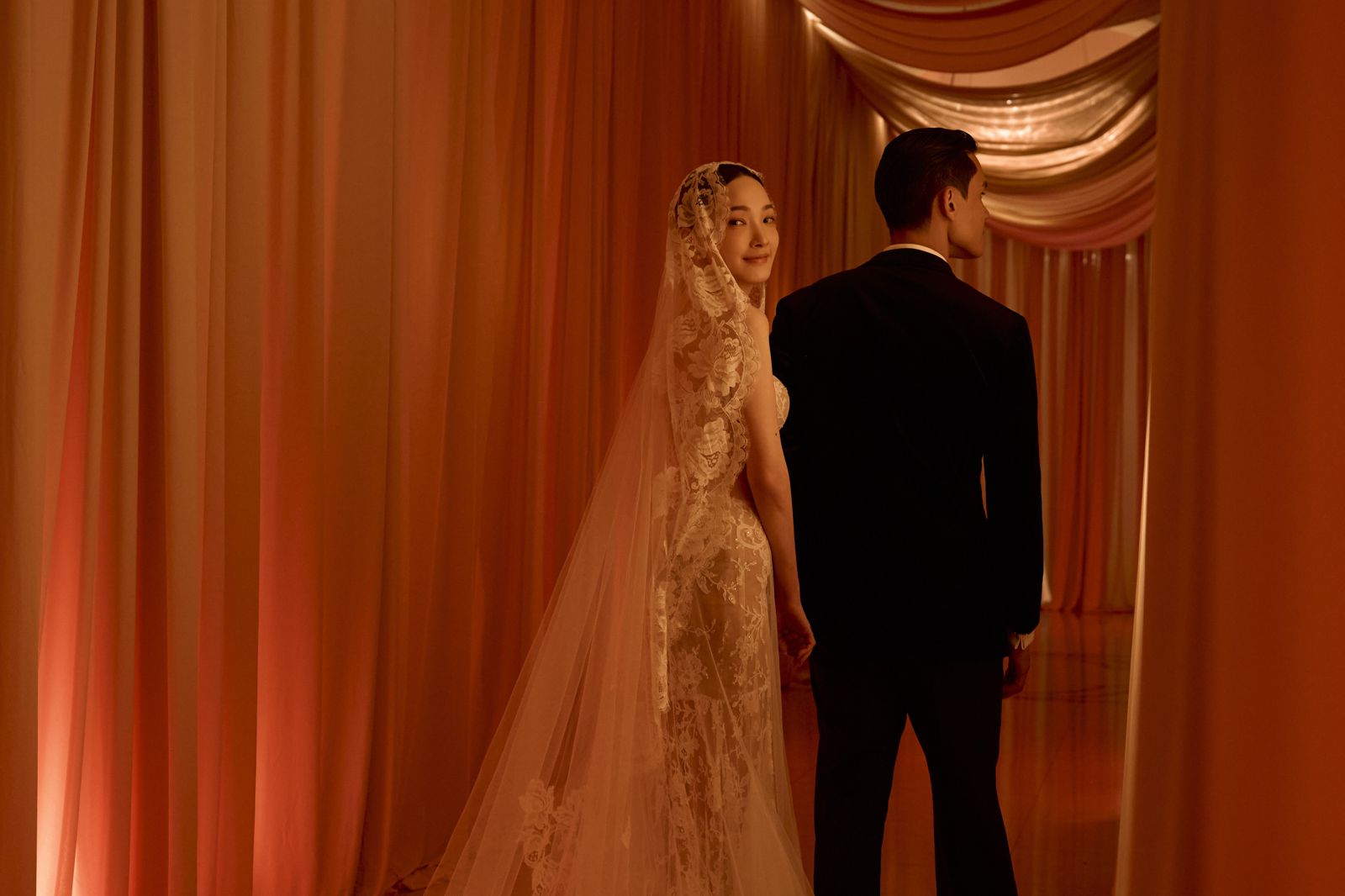 主宴會廳以劇院布幕概念設計,讓賓客踏入會場彷彿走進一部以兩人為主角的電影。親友們齊聚為新人獻上祝福,兩人內心滿滿感動,特別感謝賈靜雯擔任證婚人的重要角色。